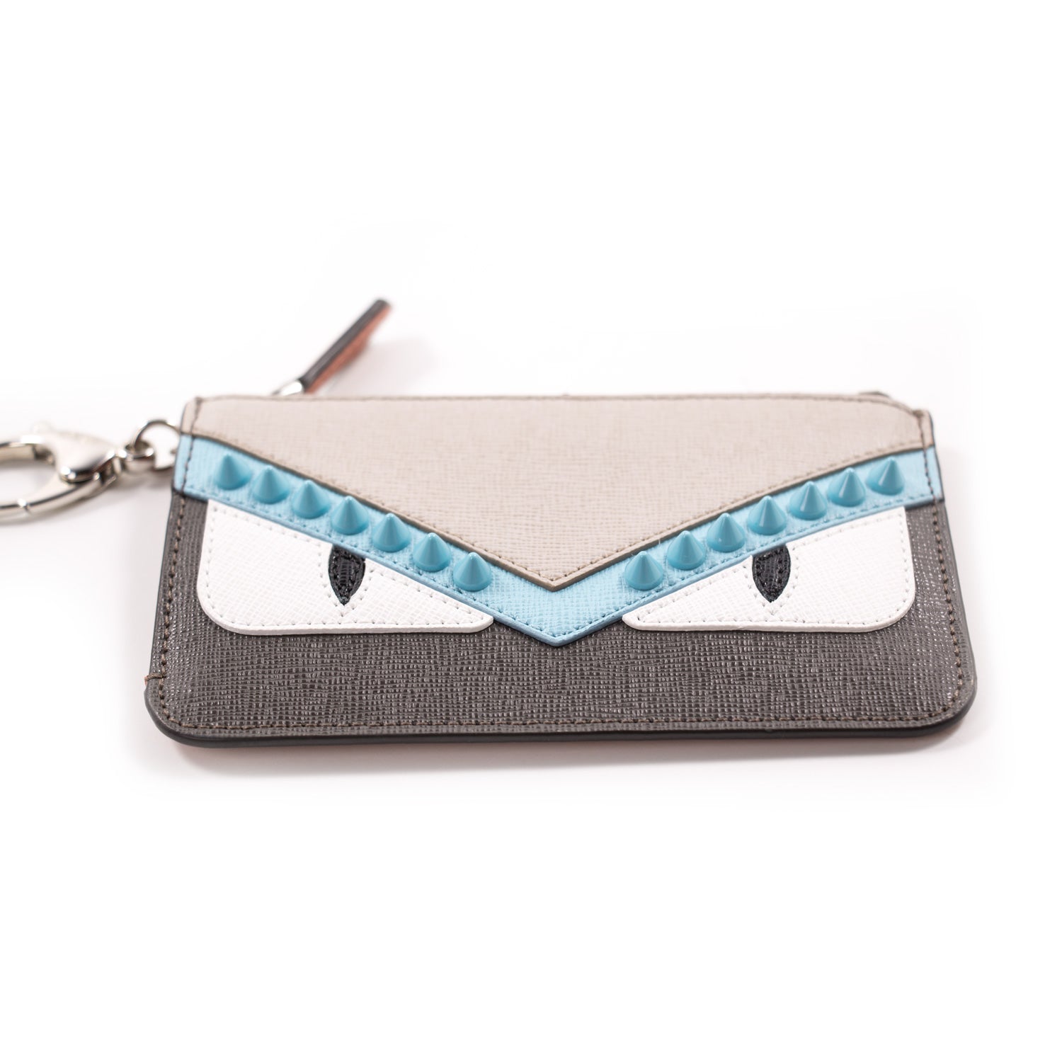 Details: Grey and Multicolor Leather / Silver-Tone Hardware / Monster Eyes and Blue Stud Embellishments at Front / Grey Fabric Lining at Interior / Interior Key Ring / Zip Closure at Top