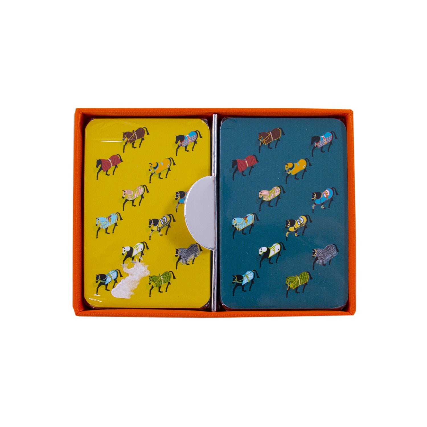 Description: Hermès Parade Bridge Playing Cards in Yellow and Green, with Multicolor Horses Parade Prints. Silver Edges