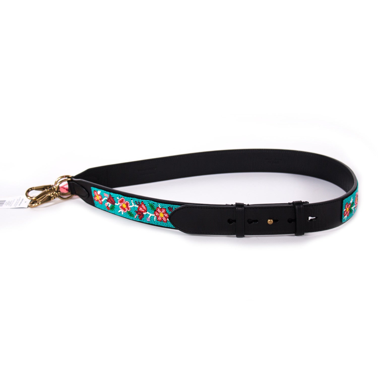 Details: Black Cow Leather / Brass Hardware / Multicolor Embellishments / Floral Pattern / Leather Lining / Adjustable Measurements