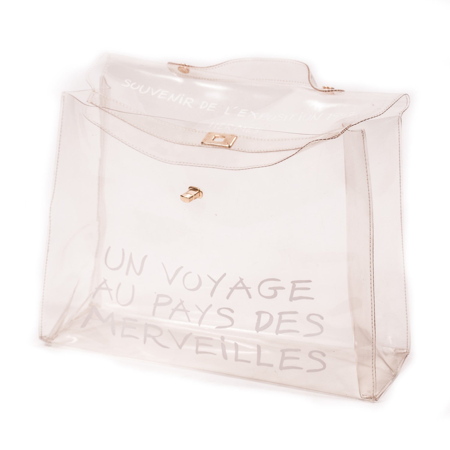 Details: Limited Edition / Transparent PVC / Gold-Tone Hardware / Single Flat Top Handle / 'Souvenir de l'Exposition 1997 Hermes' Print At Flap /'Un Voyage Au Pays Des Merveilles' Motif / Front Flap Turn Lock Closure