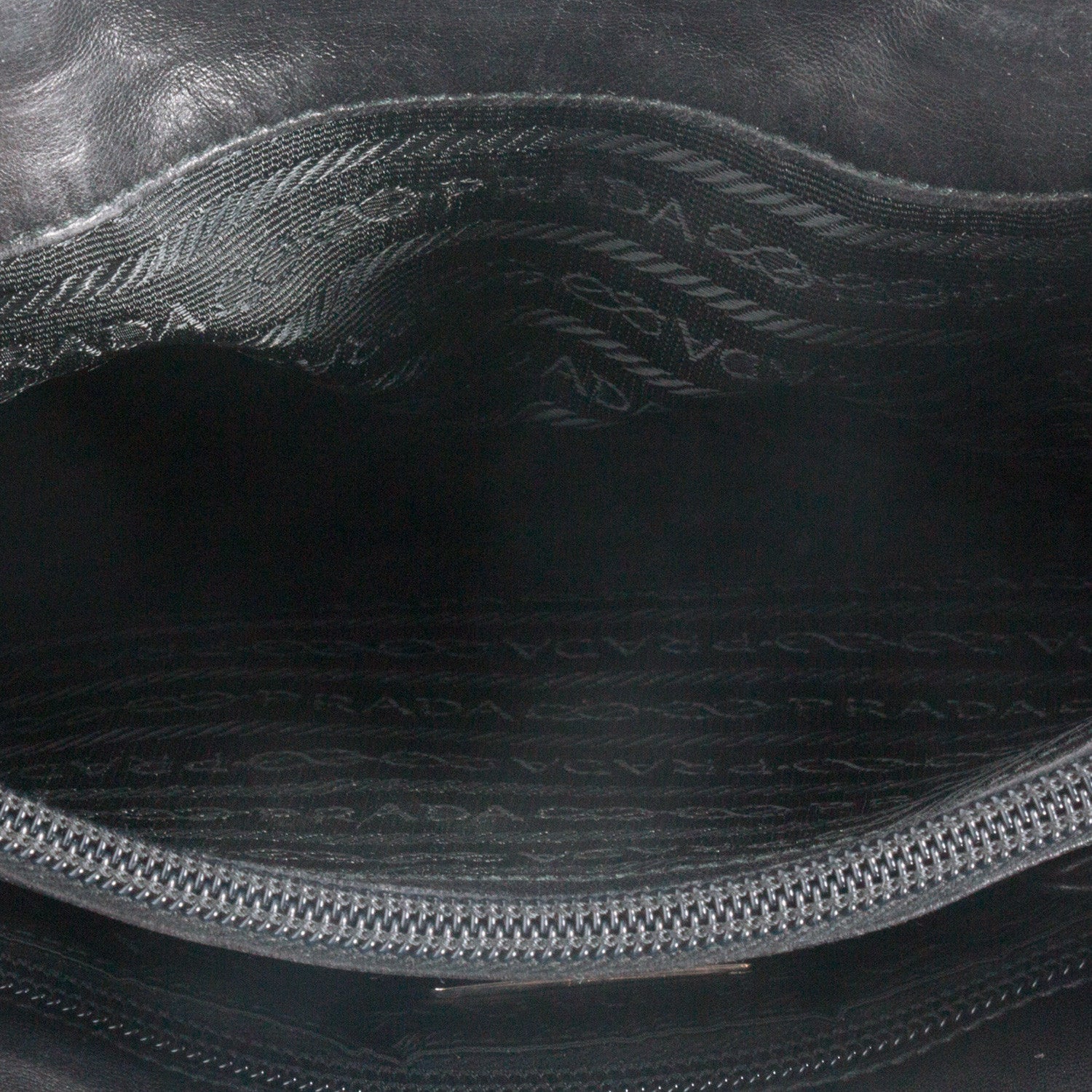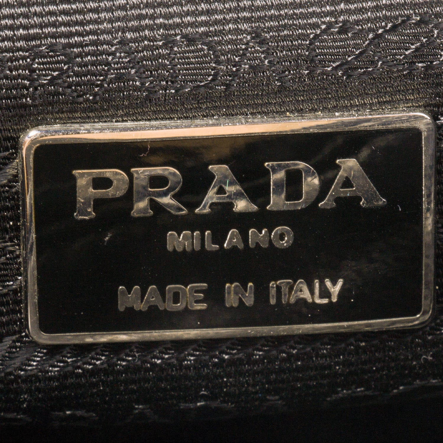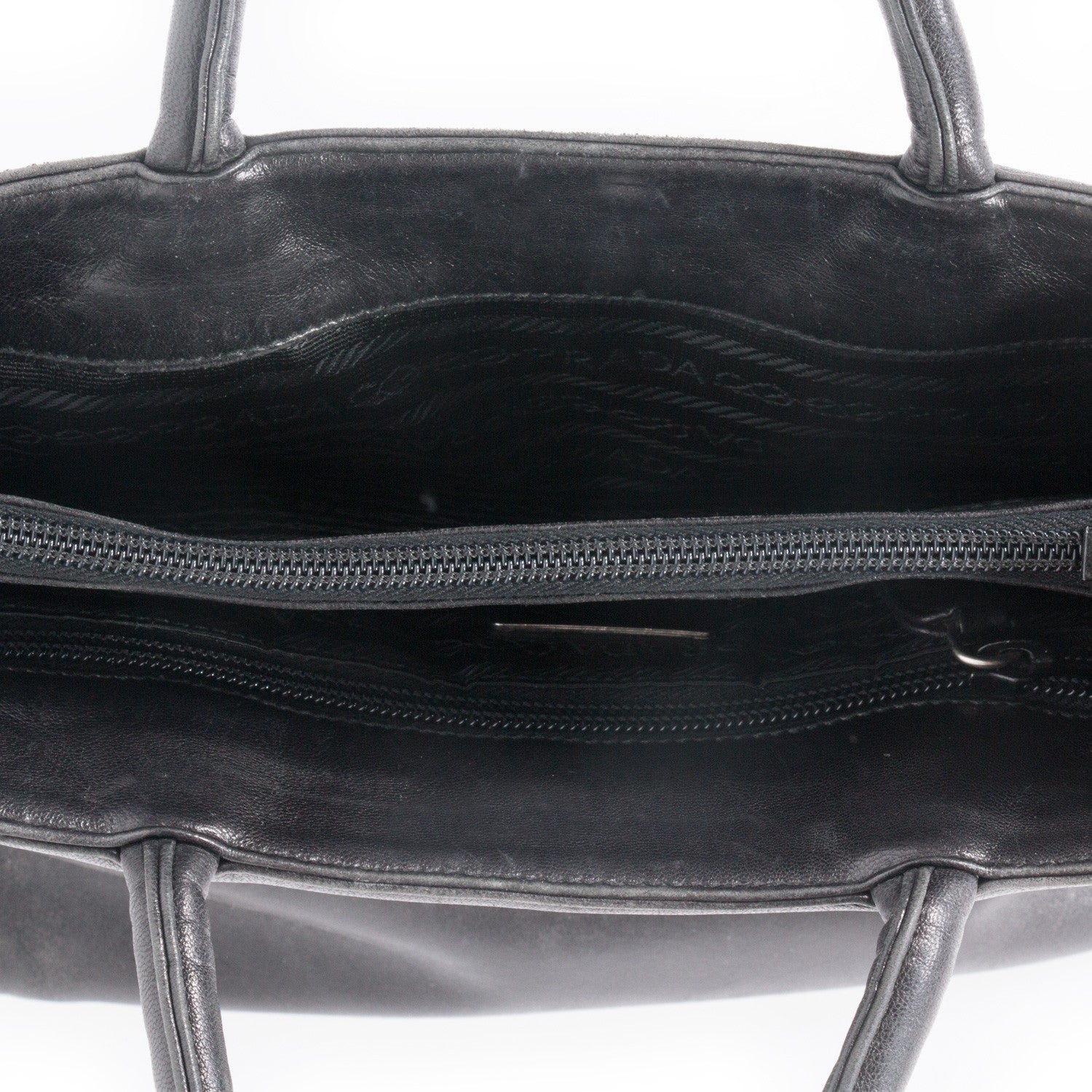 Details: Black Prada Tote / Silver Tone Hardware / Tonal Stitching / Logo At Front / Dual Rolled Top Handles / Black Logo Print Woven Lining / Three Compartment, One  / Zipper Pocket At Interior Wall