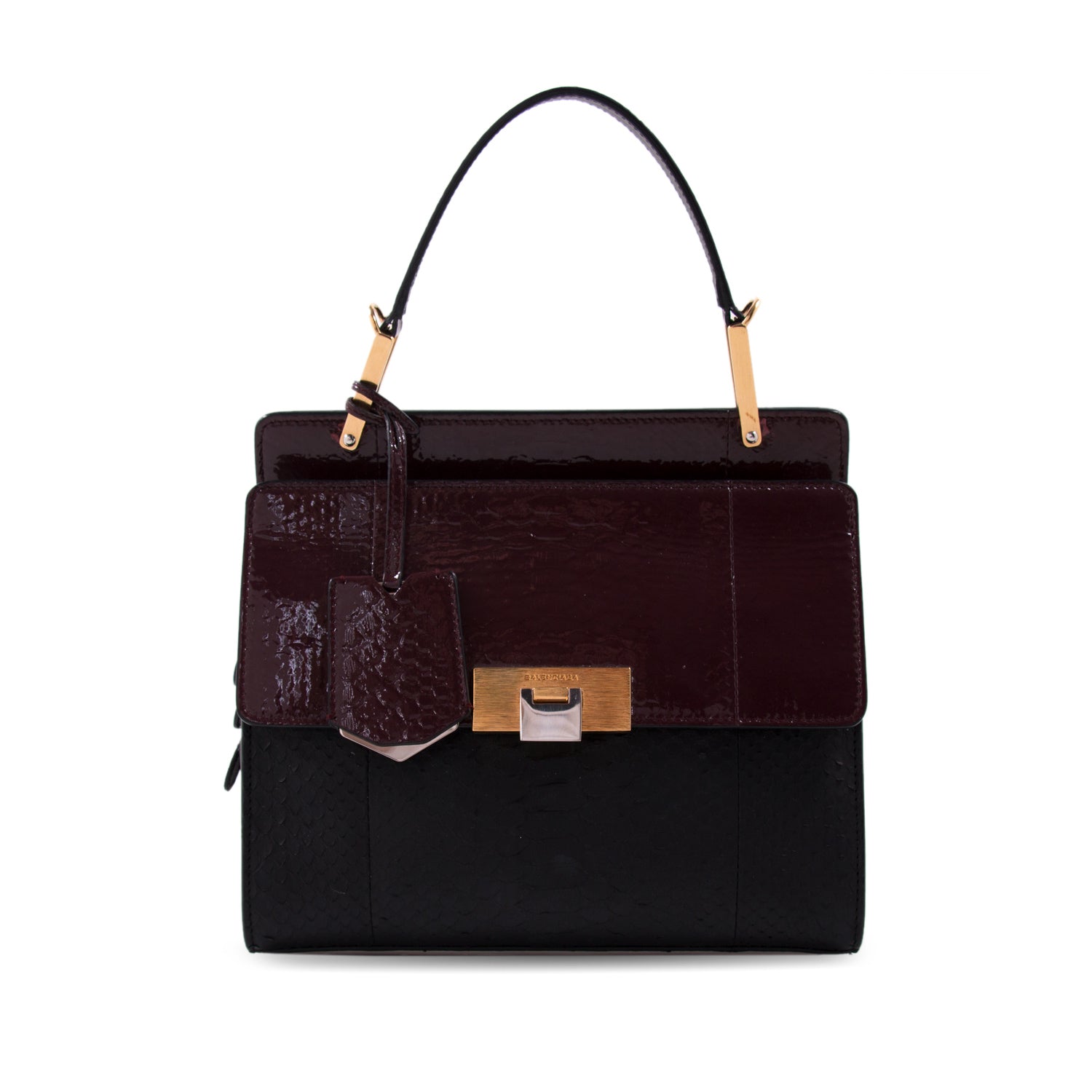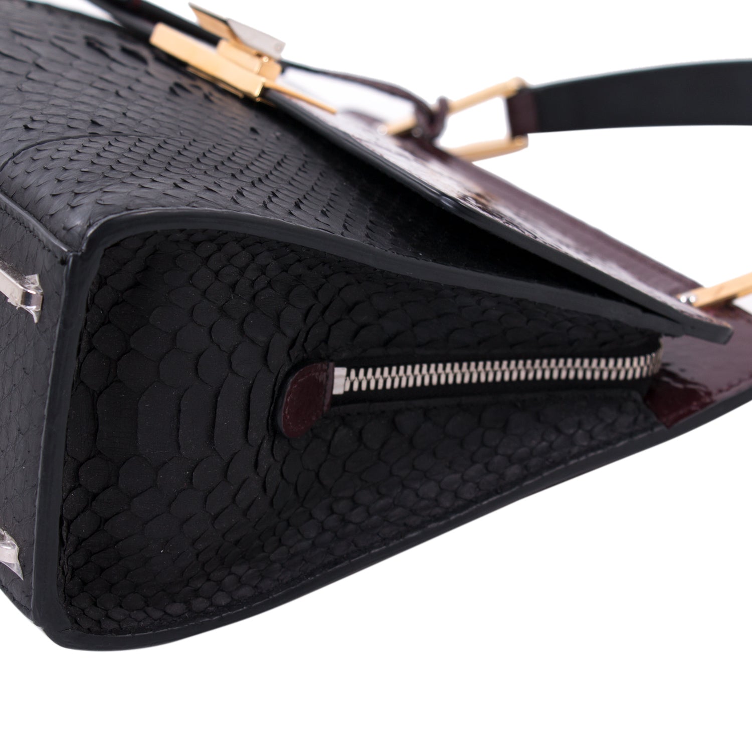 Details: Burgundy and Black Python Leather / Gold and Silver-Tone Hardware / Rolled Handle and Detachable Shoulder Strap / Flap Pocket at Front / Black Leather Interior Lining / Zipper and Dual Slit Pocket at Inside / Zipper Closure at Top