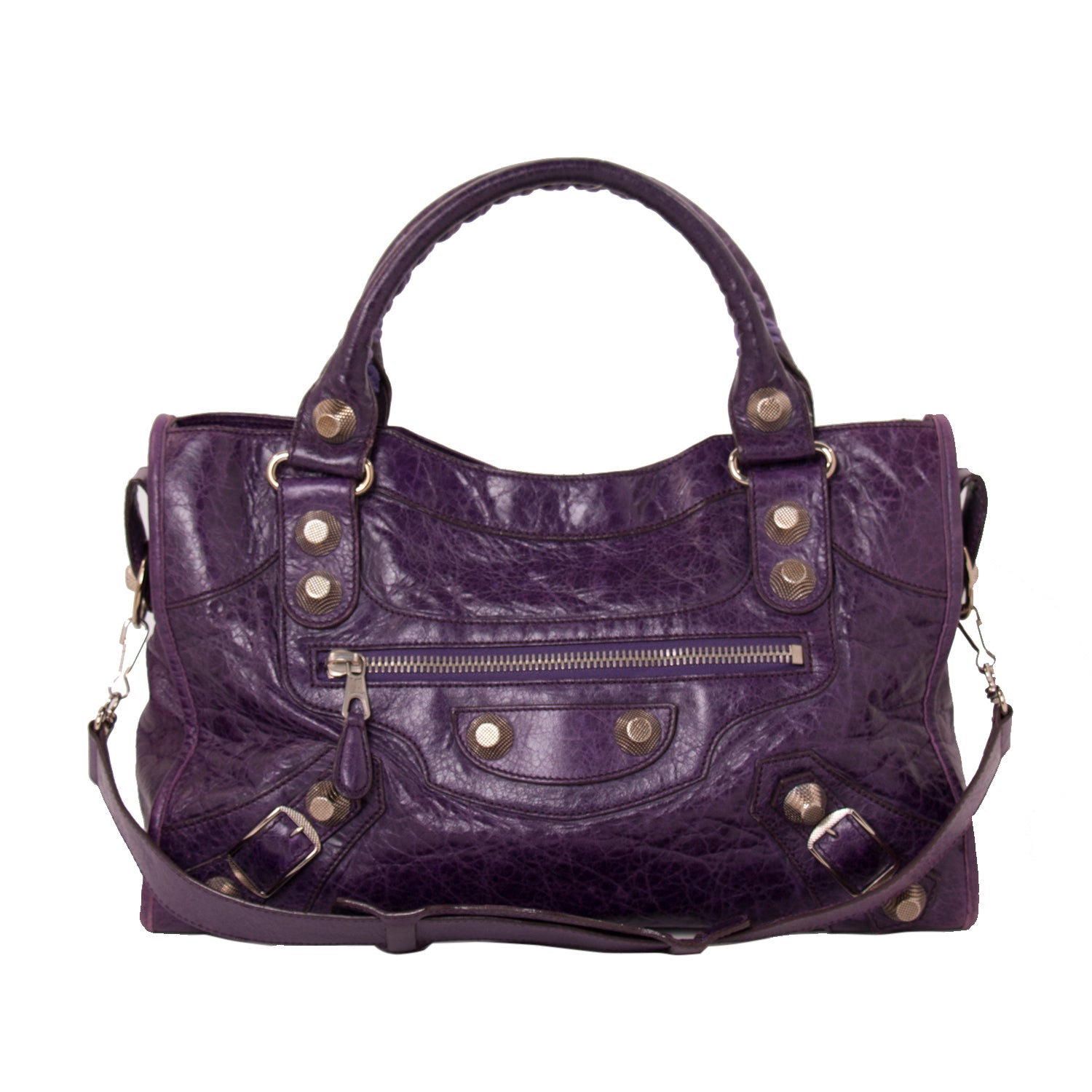Details: Purple Agneaux Leather / Silver-Tone Hardware / Dual Rolled Handles / Detachable Shoulder Strap / Zipper Pocket at Front Face / Studs Embellishments Throughout the Exterior Front / Black Fabric Lining / One Zip Pocket at Interior / Zipper Closure at Top