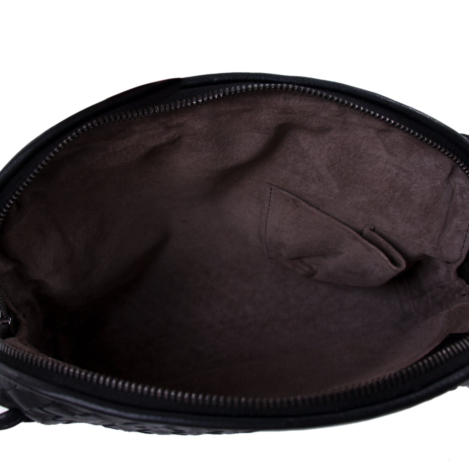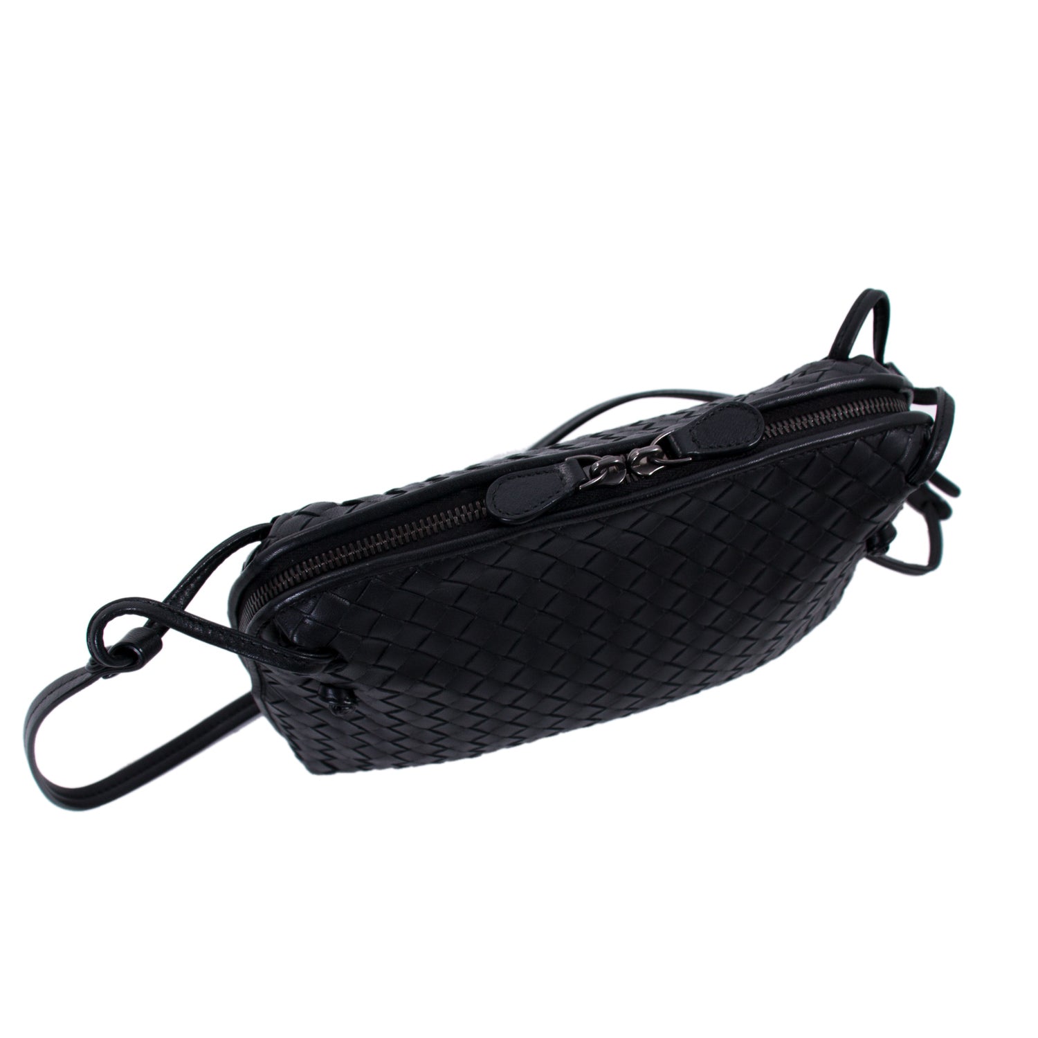 Details: Black Intrecciato Leather / Black Metal Hardware / Long Adjustable Shoulder Strap / Brown Suede Lining / Zipper and Flat Pocket at Interior / Dual-Way Zipper Closure at Top