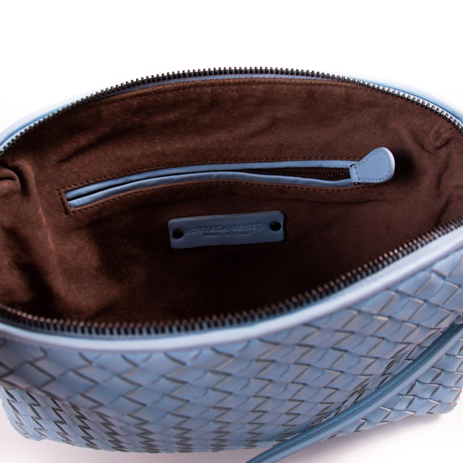 Details: Sky Blue Intrecciato Leather / Black Metal Hardware / Long Adjustable Shoulder Strap / Brown Suede Lining / Zipper and Flat Pocket at Interior / Dual-Way Zipper Closure at Top