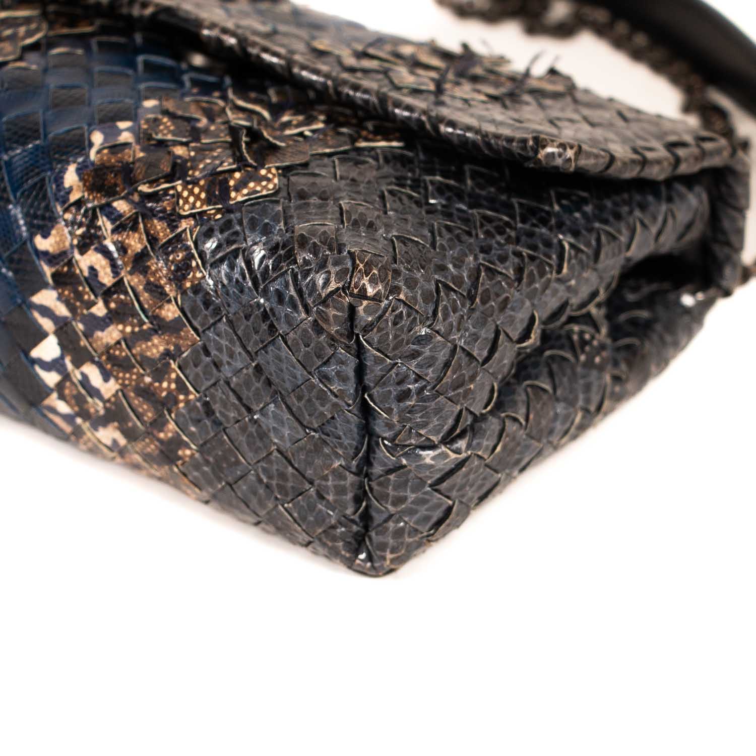 Details: Grey, Brown and Blue Intrecciato Woven Snake Skin Leather / Black Metal Hardware / Chain Link Strap with Leather Pad / Flap Top With Snap Closure / Interior Suede Lining / Two Large Inside Compartments and One Small Inside Compartment for Cards