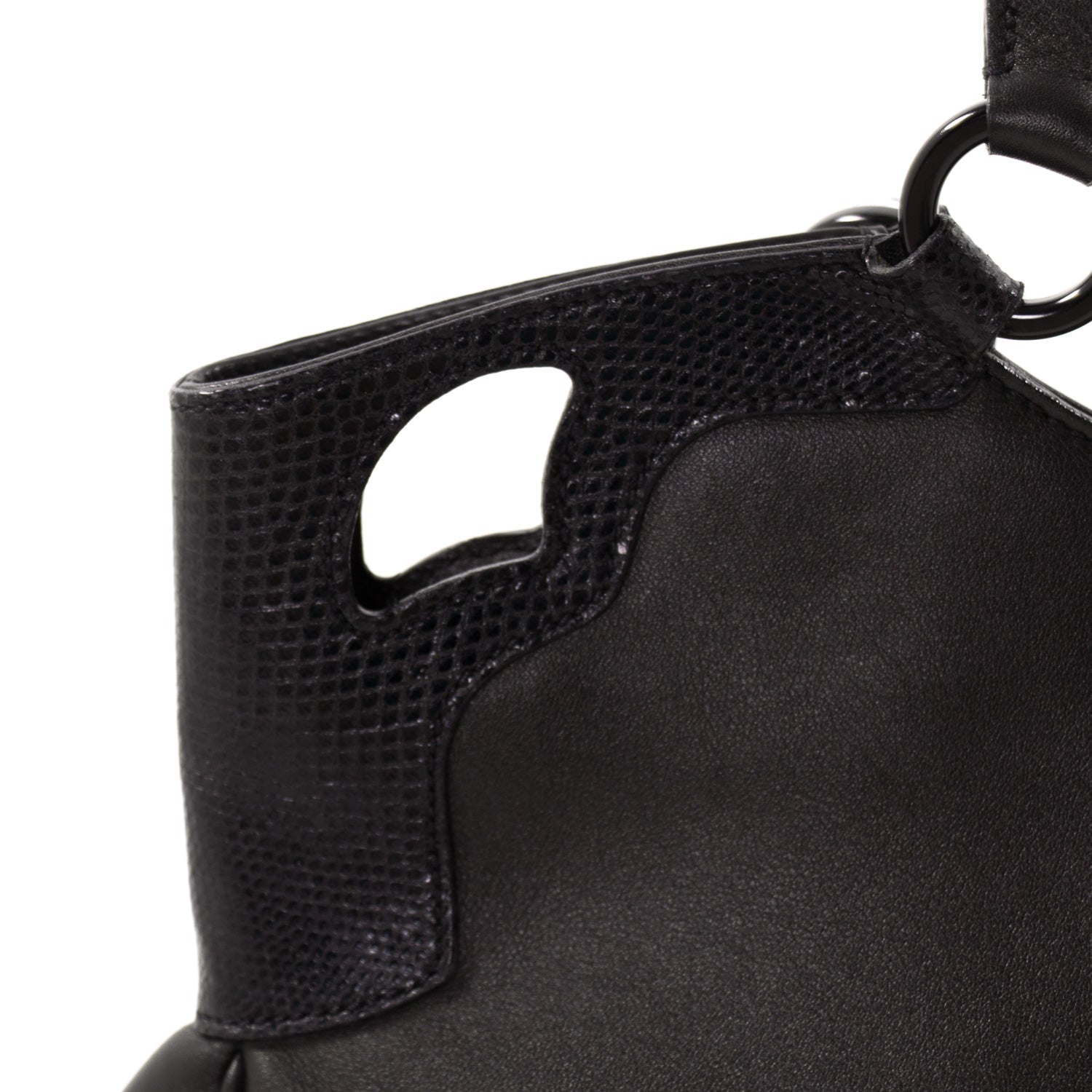 Details: Black Smooth Leather with Lizard Trims / Black and Silver-Tone Metal Hardware / Dual Rolled Handles / Exterior Pocket at Back / Perforated Logo at Front / Beige Logo Print Woven Lining / Single Compartment with Dual Pockets, One with Zipper / Zip Closure at Top