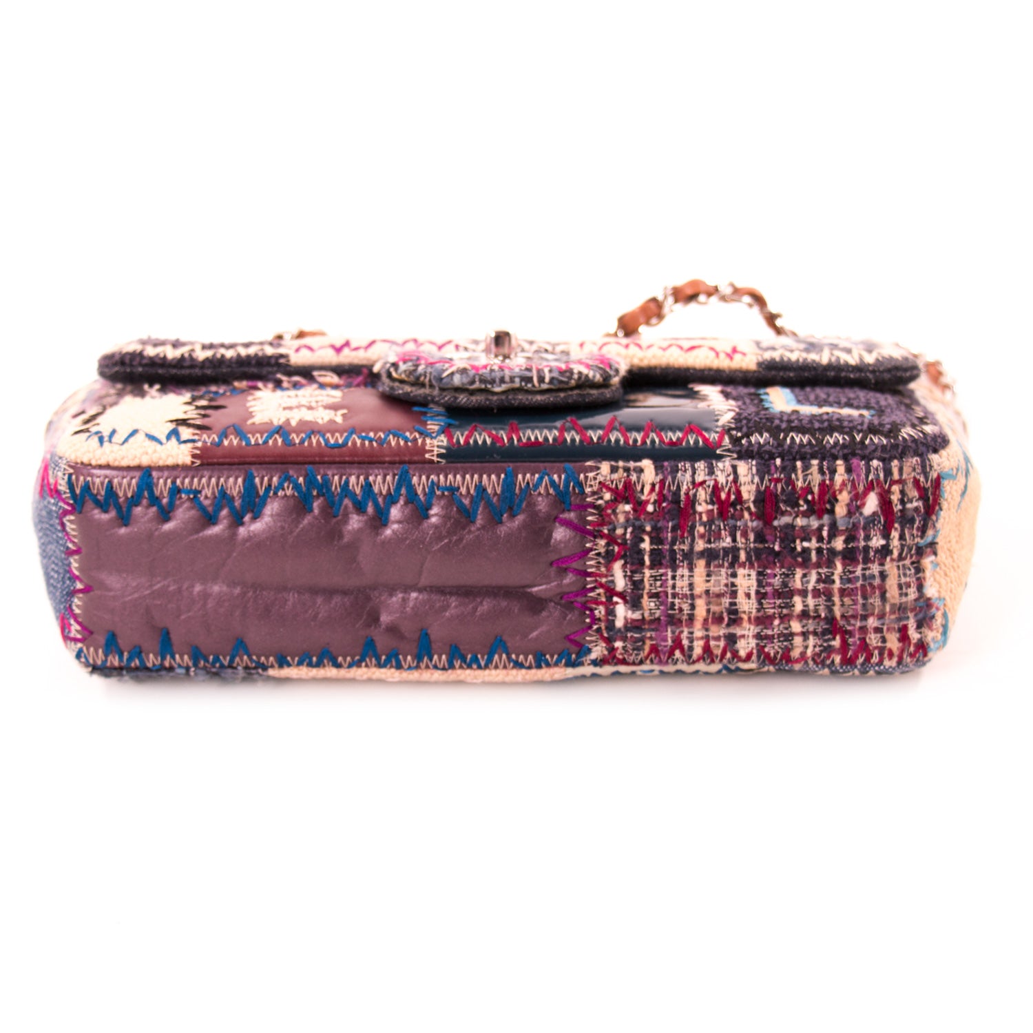 Details: Multicolor Denim, Leather, Raffia, Tweed, Fabric, Patchwork, and Others / Silver-Tone Hardware / Chain-Link and Brown Leather Shoulder Strap / Blue Denim Fabric Lining at Interior / Single Compartment with Zipper and Flat Pocket / Turn-Lock Closure at Front Flap