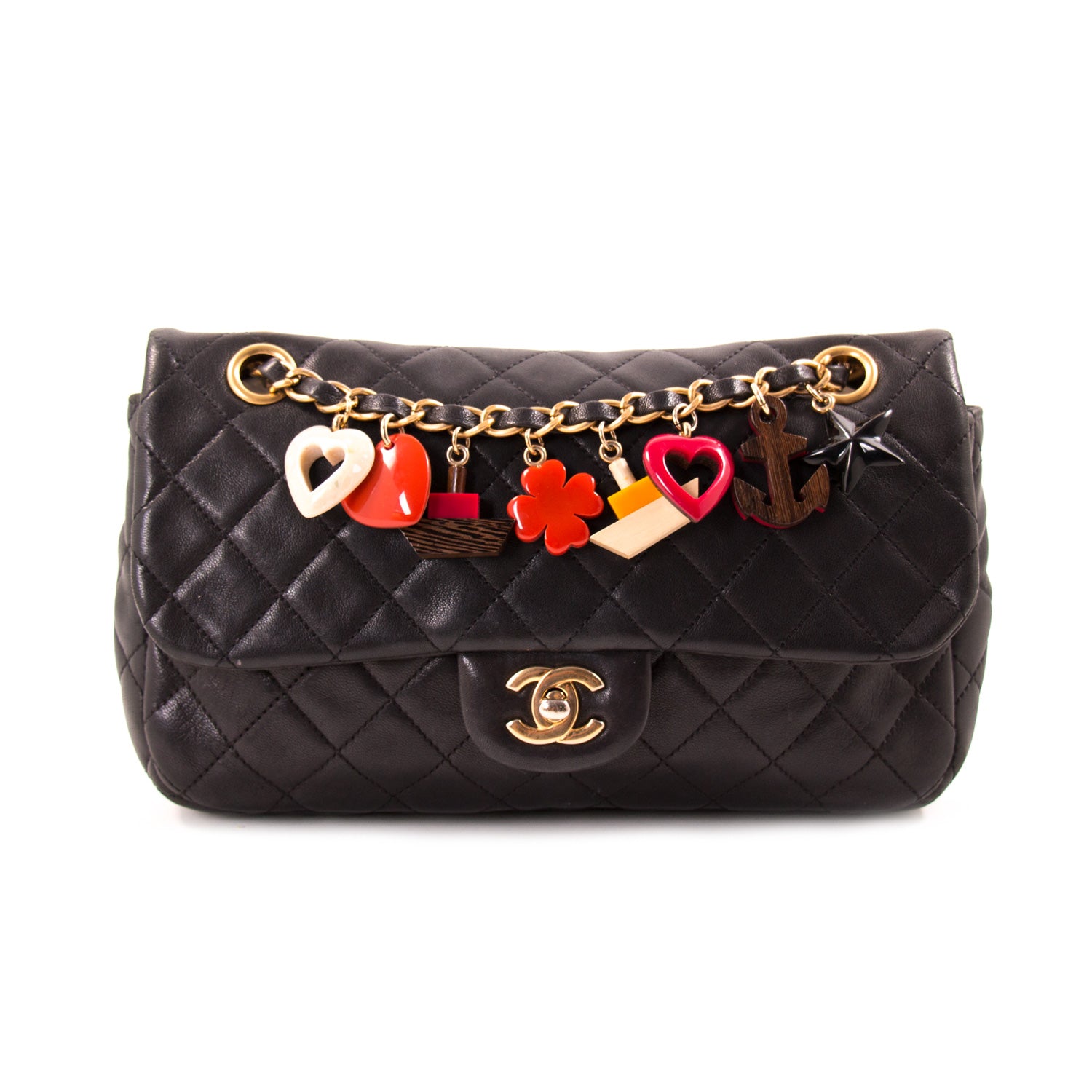 Details: Black Lambskin Quilted Leather / Gold-Tone Hardware / Chain-Link and Leather Shoulder Strap / Hearts and Other Embellishments Attached to the Chain / Single Compartment with Fabric Lining / Zipper Pocket at Inside / Turn-Lock Closure at Front Flap