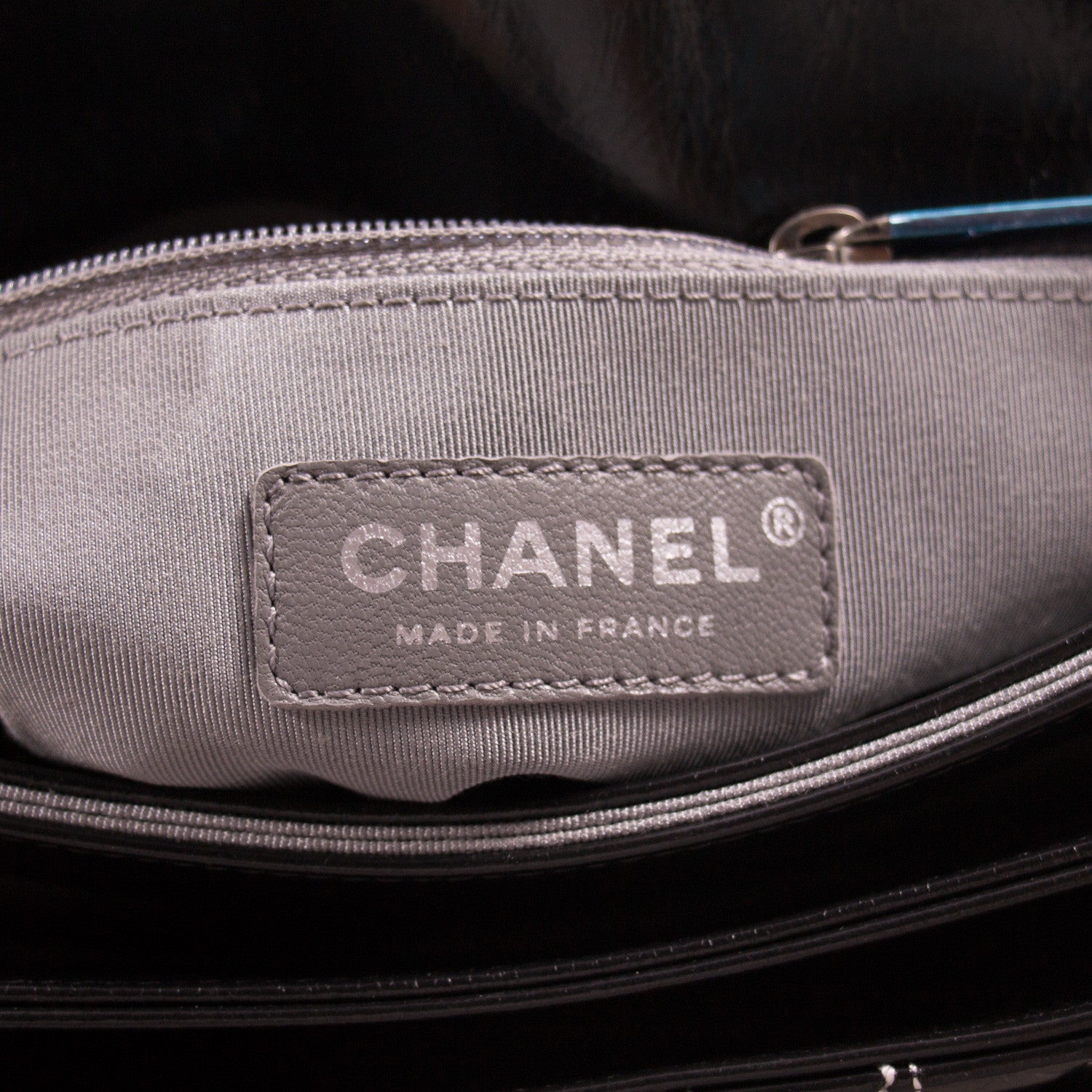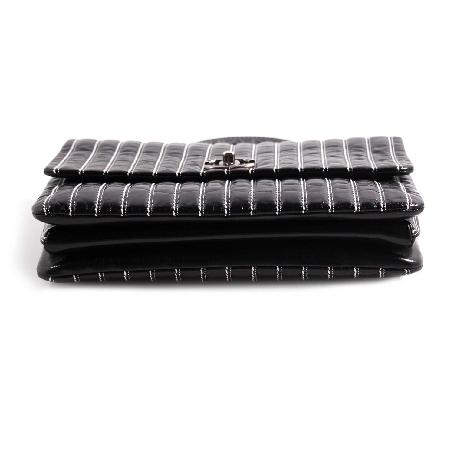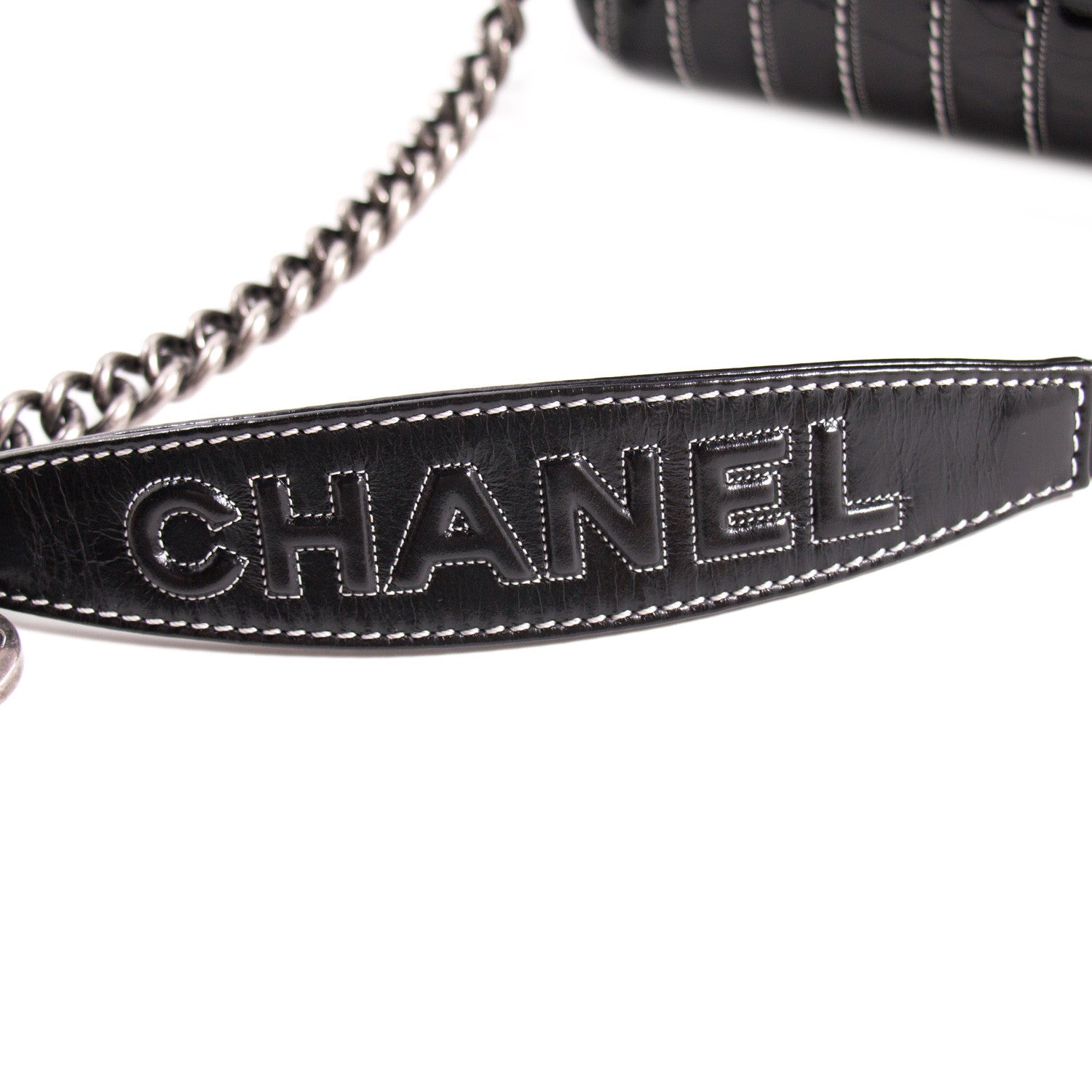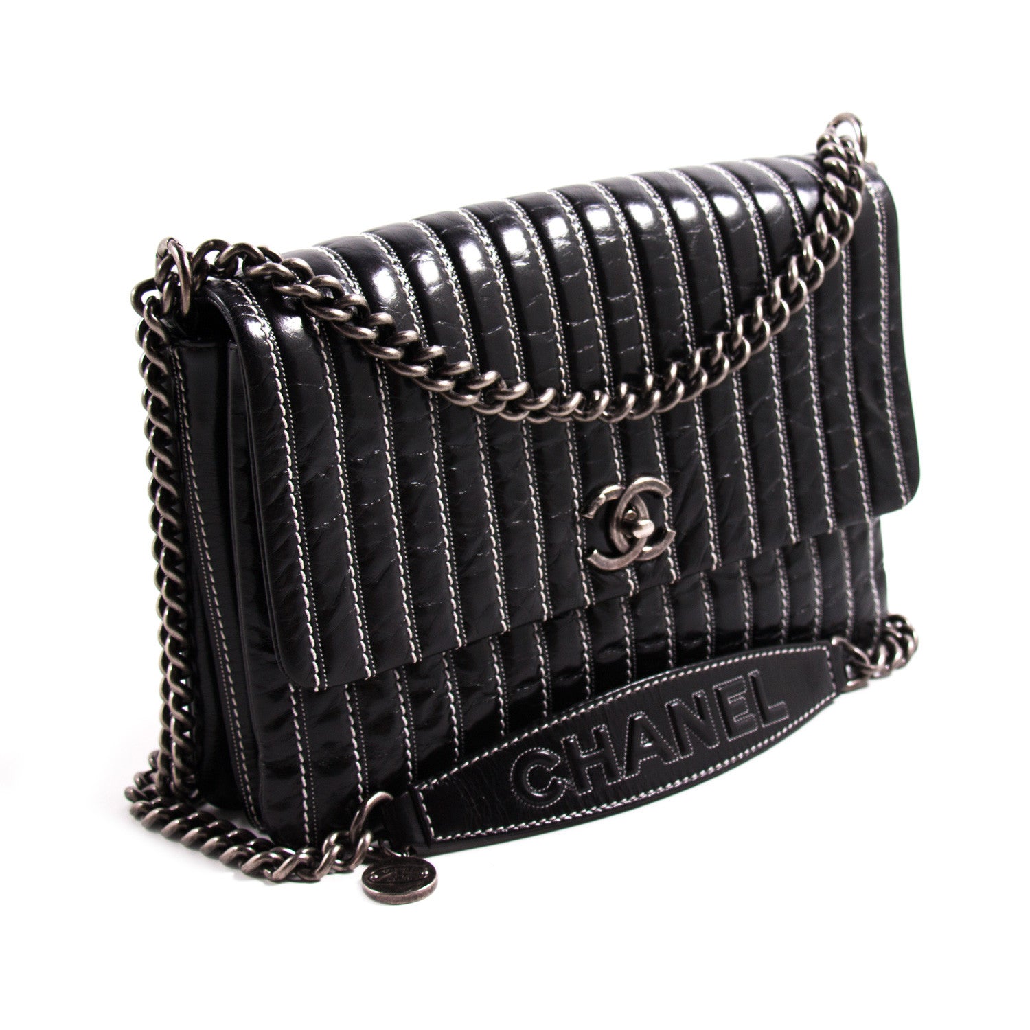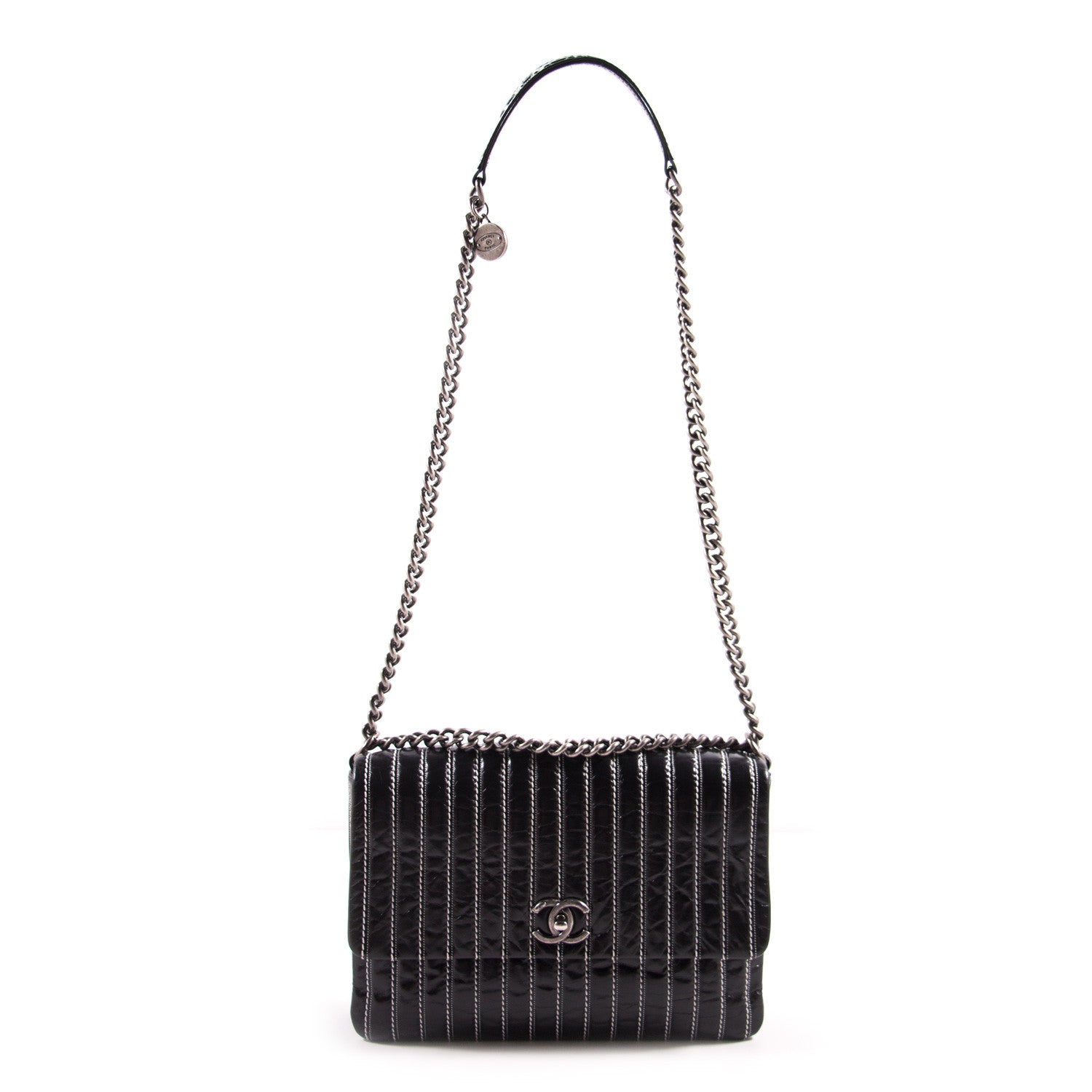 Details: Black Patent Leather / Antiqued Silver Hardware / White Vertical Stitching Pattern / Dual Chain Shoulder Strap With Black Leather Pad / Grey Fabric Interior Lining / Three Compartments / Zip Closure at Interior Wall / CC Turn Lock Closure at Front Flap