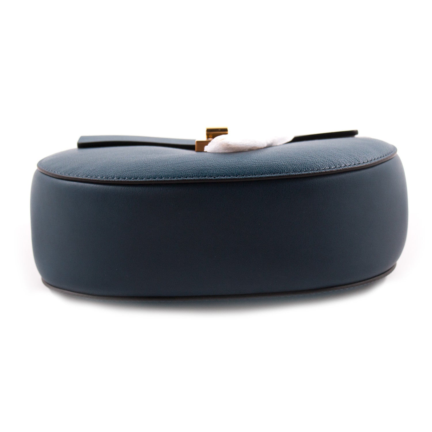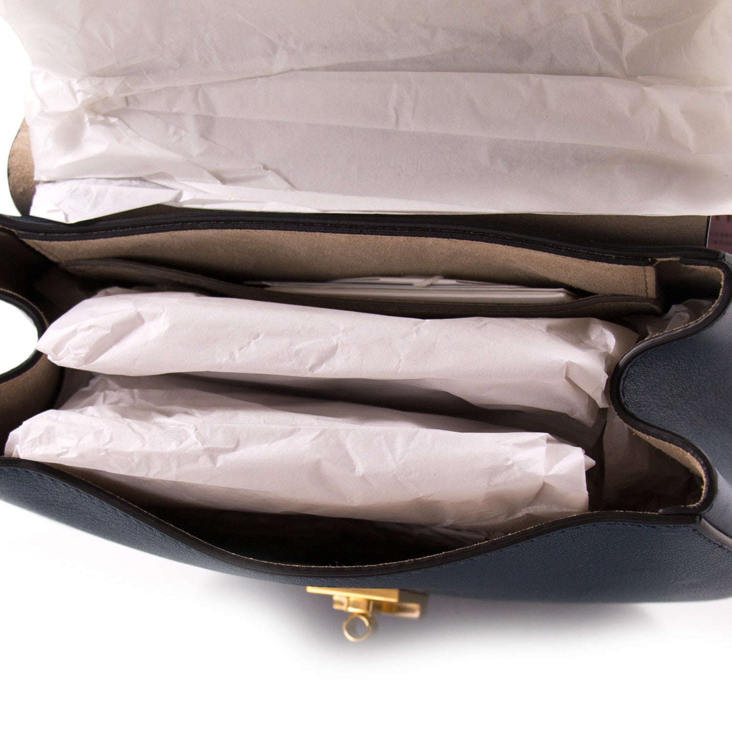 Details: Navy Blue Goat Leather / Gold-Tone Hardware / Chain Shoulder Strap / Calf Leather Trim / Beige Interior Suede Lining / One Compartment With Single Pocket / Turn Lock Closure at Front Flap