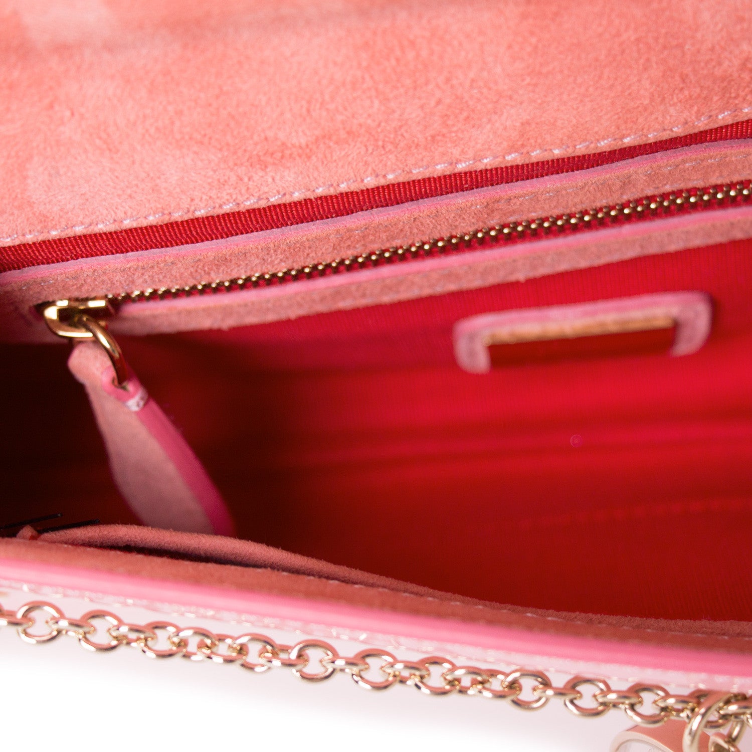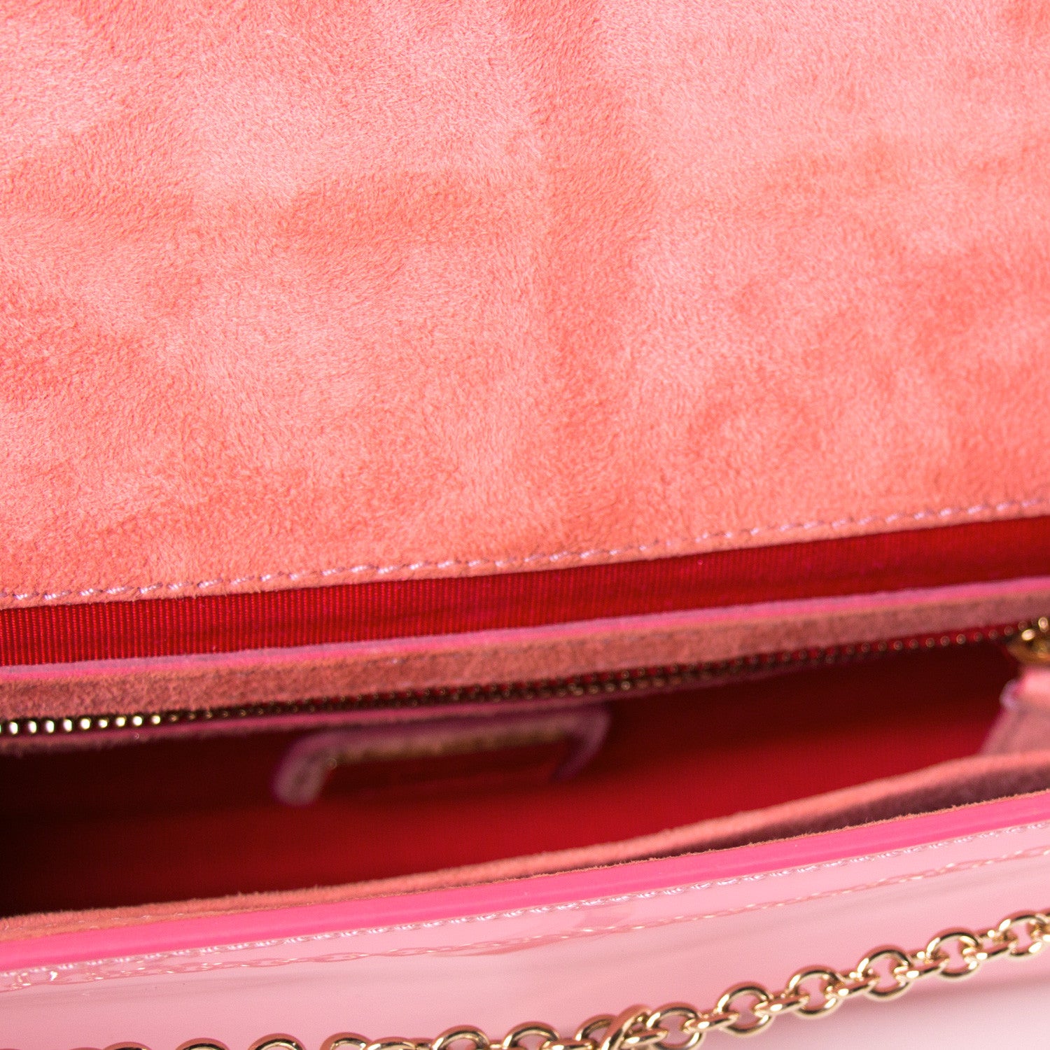 Details: Pink Patent Leather / Gold-Tone Hardware / Detachable Shoulder Strap / Flat Pocket at Exterior Back / Twill and Suede Lining at Interior / Slit Pocket and Zip Pocket at Interior Compartment / Magnetic Snap Closure at Front Flap / Clear Logo Medalion Embellishment Attached To The Flap