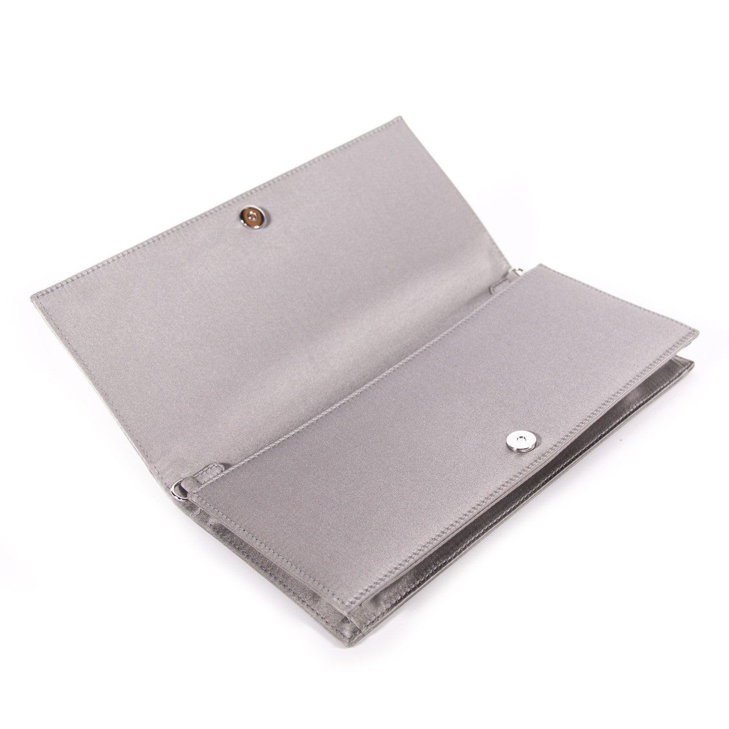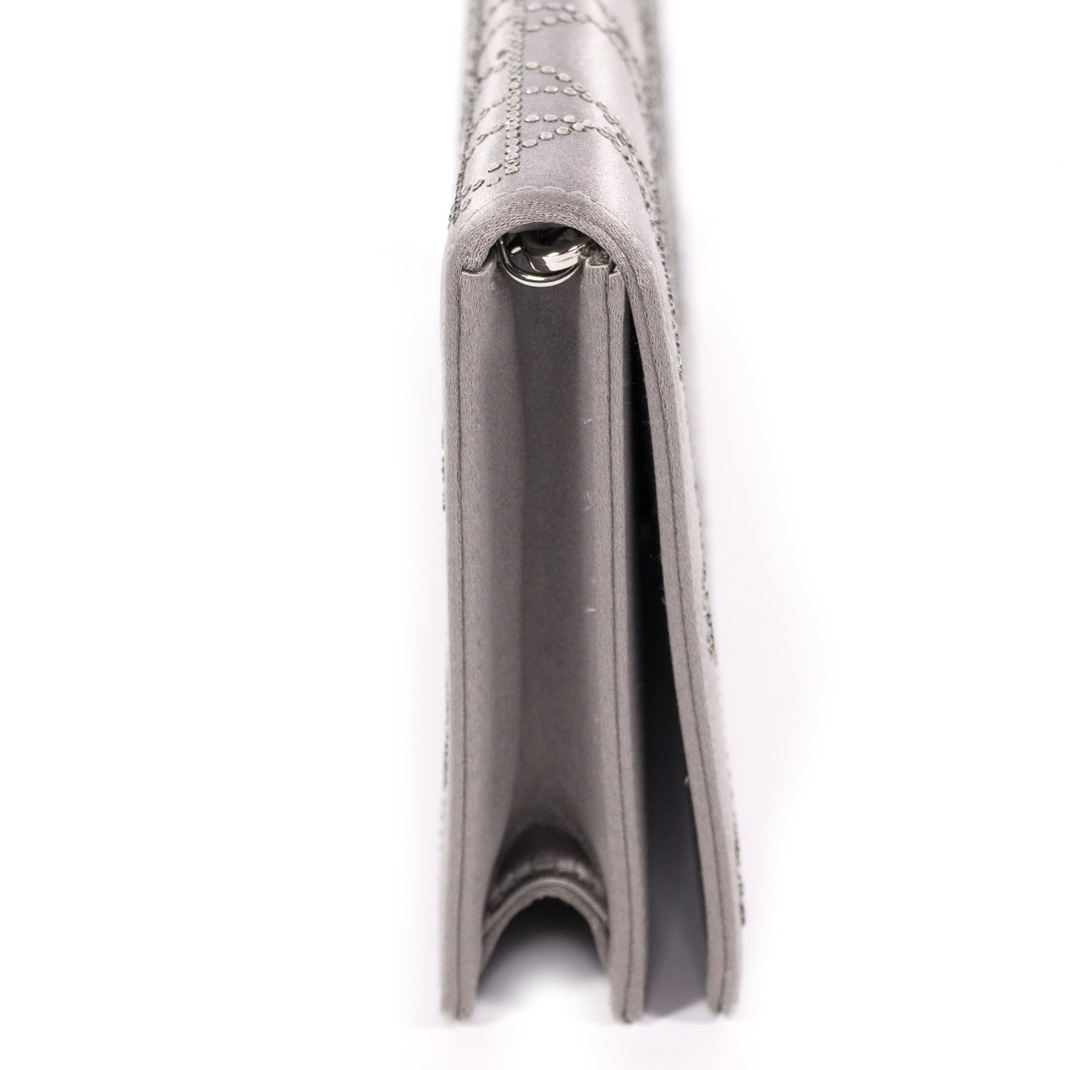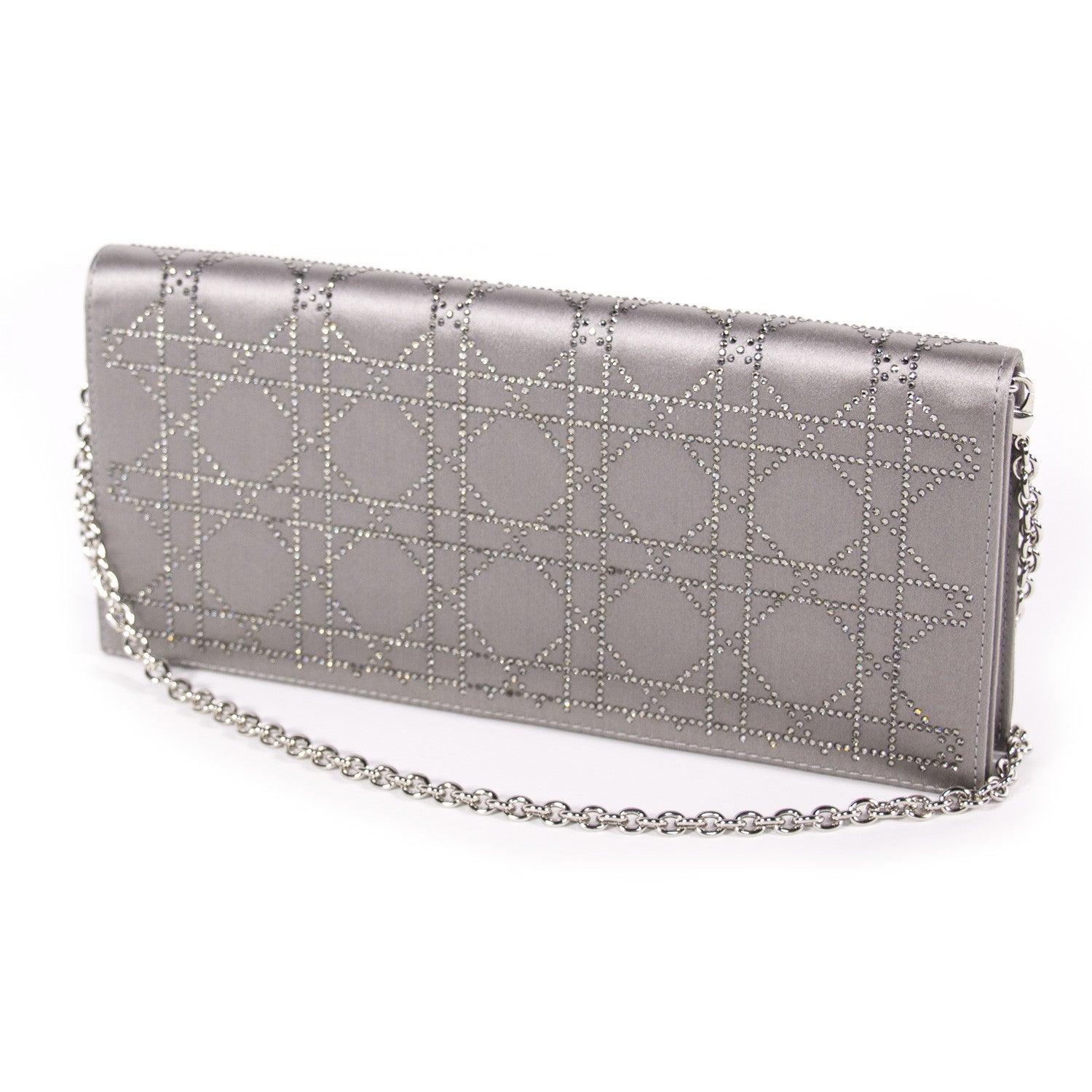 Details: Grey Cannage Satin / Silver Tone Hardware / Crystal Embellishment At Front And Back / Detachable Shoulder Strap / Grey Satin Lining At Interior / Single Compartment / Single Slit Pocket / Magnetic Snap Closure At Front
