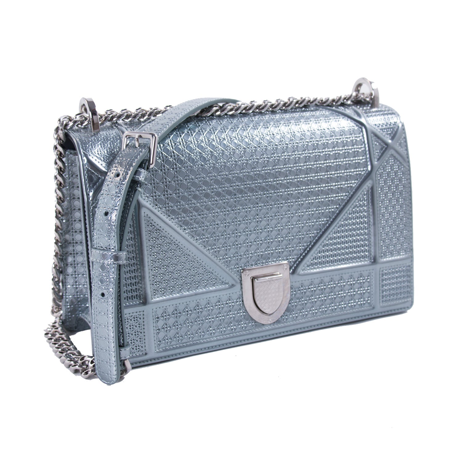 Details: Metallic Leather / Silver-Tone Hardware / Adjustable Shoulder Strap / Black Leather Lining at Interior / One Zipper Pocket and One Slit Pocket / Push-Lock Closure at Front Flap