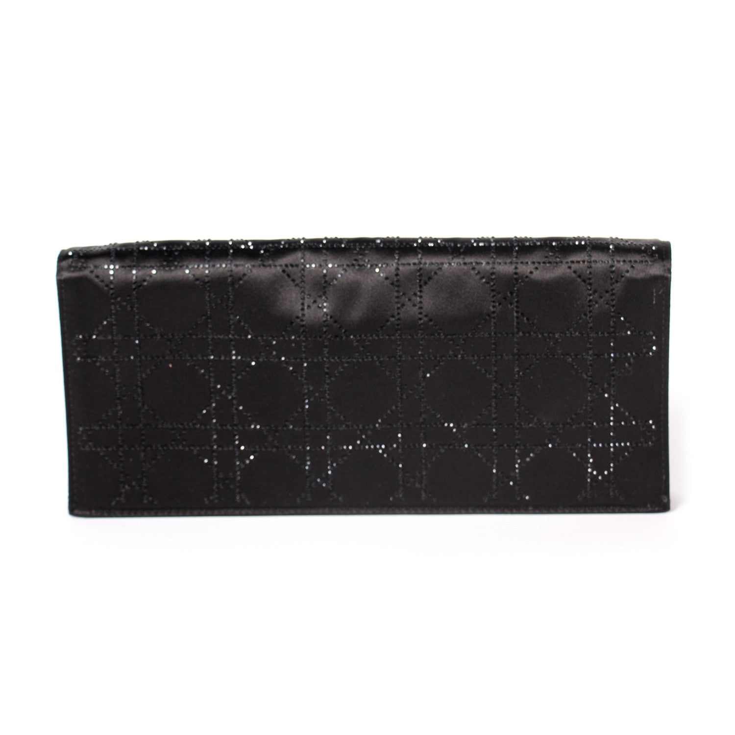 Details: Black Cannage Satin / Crystal Embellishment Throughout / Cannage Pattern / Detachable Shoulder Strap / Satin Interior Lining / Single Compartment / Slit Pocket / Magnetic Snap Closure at Front Flap