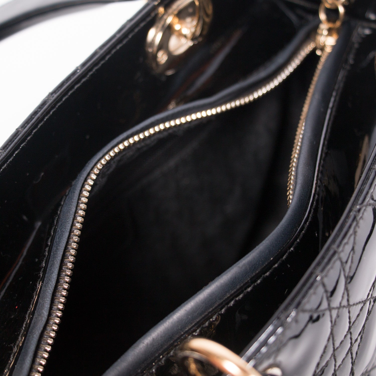 Details: Black Cannage Patent Leather / Gold Tone Hardware / Dual Rolled Handles / "DIOR" Logo Adornment At Front Face / Protective Studs At Base / Black Diorissimo Fabric Lining At Interior / Zip Pocket At Interior / Zip Closure At Top