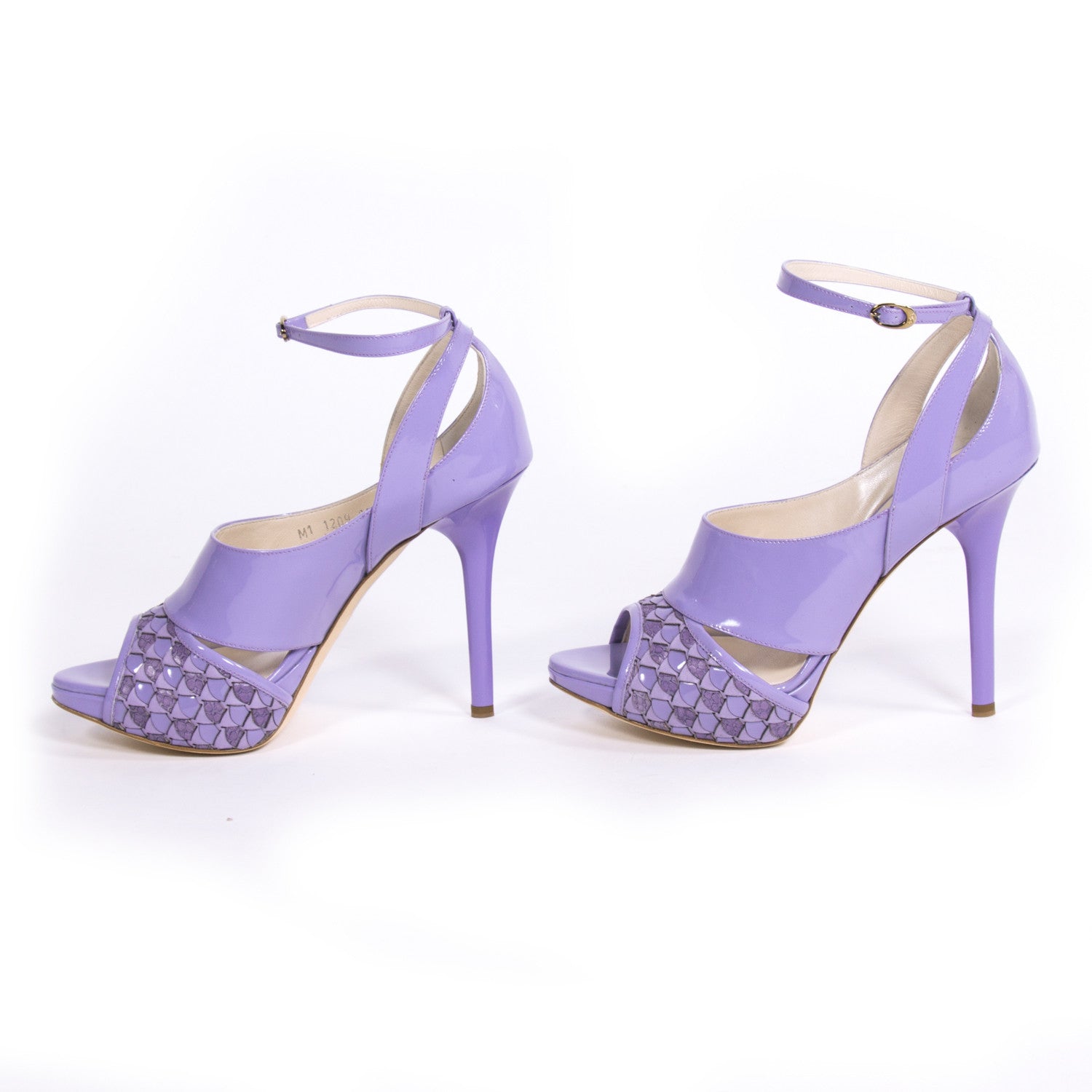 Details: Combination Of Light Purple Vernie Leather And Purple Snake Skin / Open Toe / Tonal Stitching / Dior Engraved Buckle Closure Strap At Ankle Strap / Leather Lining and Sole / Covered Heels / Nude Inside Leather