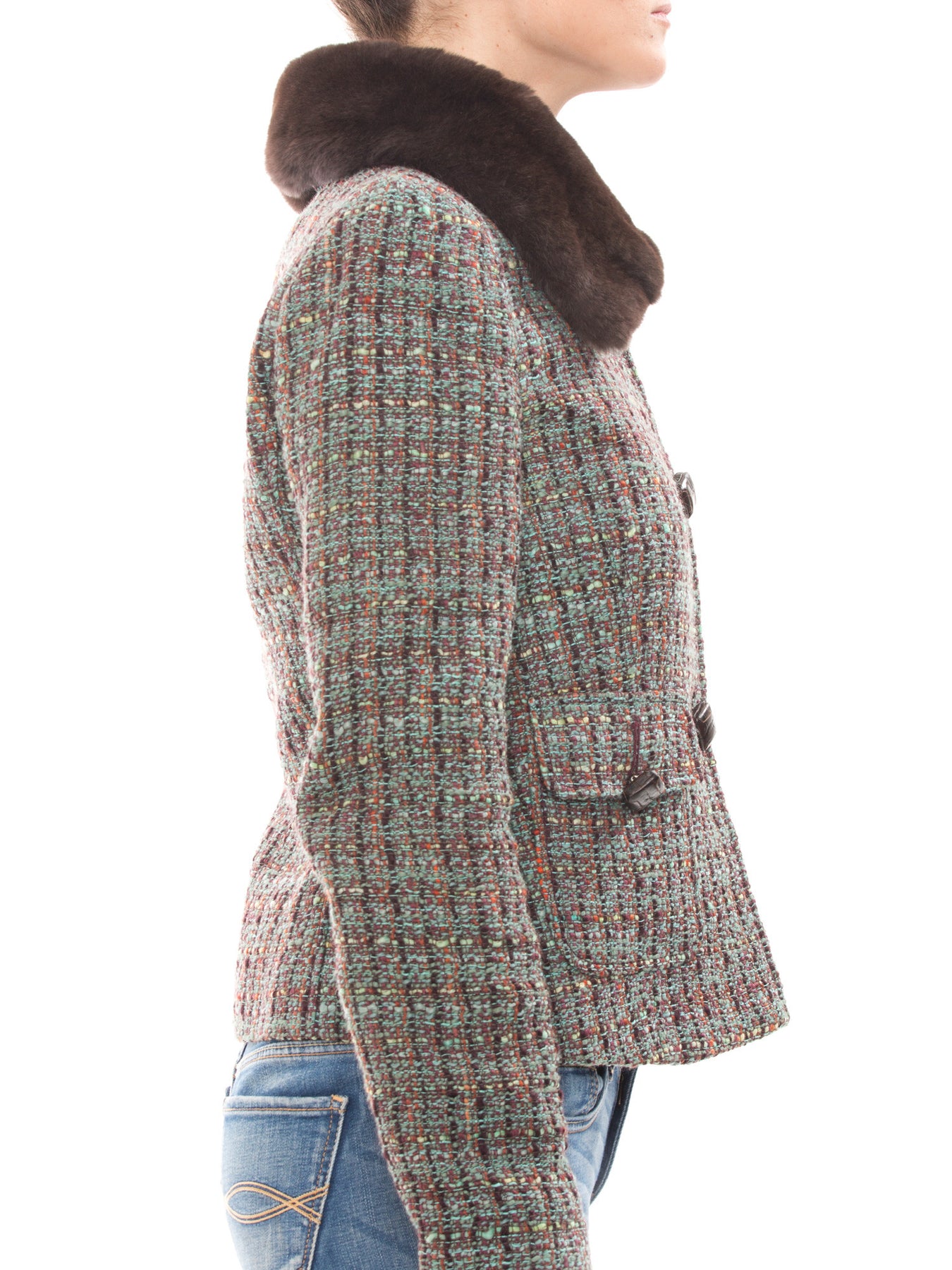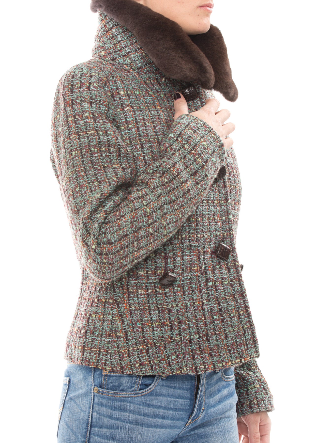 Details: Green Color / Tweed Jacket / Flap Pockets at Sides / Button Closure / Embellished Collar / Button Closure at Front