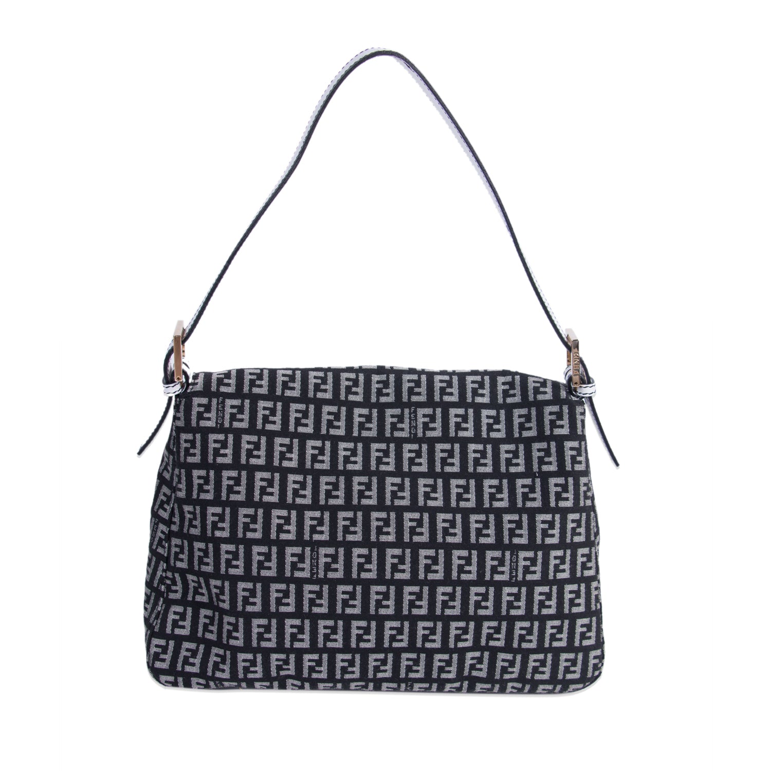Details: Black and Grey Fendi Zucca Canvas / White Leather Trim / Gold-Tone Hardware / Logo at Front / Adjustable Shoulder Strap / Black Fabric Interior / Zipper Pocket at Inside / Magnetic Snap at Front Flap