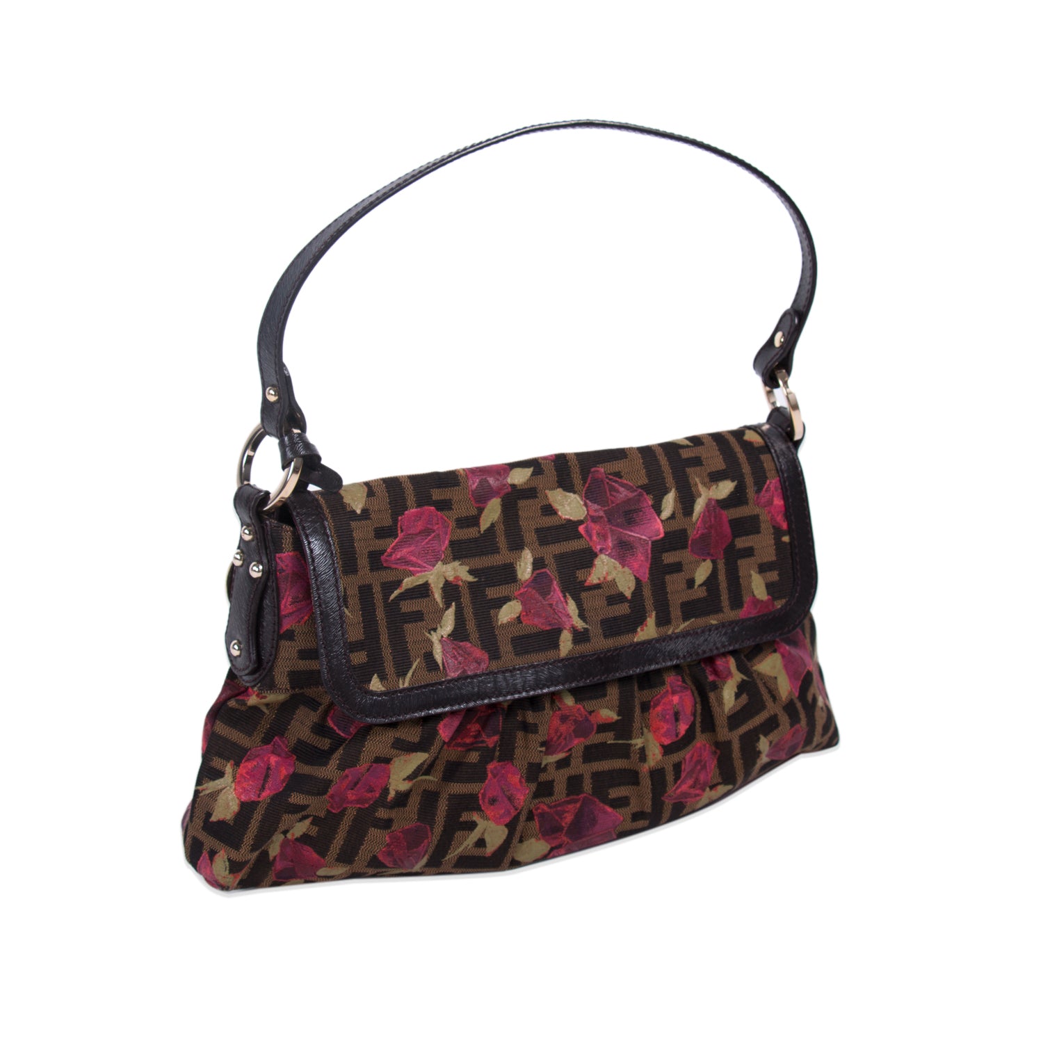 Details: Brown Fabric with Floral Prints Throughout / Gold-Tone Hardware / Single Rolled Handle / Brown Leather Trim / Brown Fabric Interior / Flat Pocket at Inside / Magnetic Snap Closure at Front