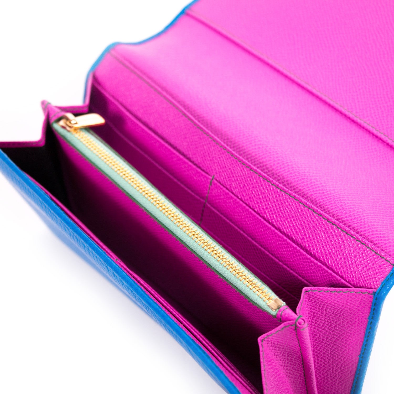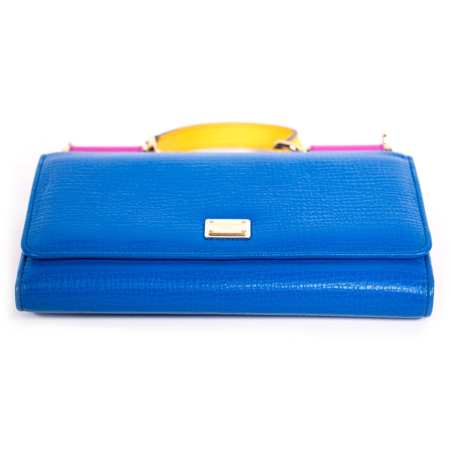 Details: Blue And Pink Grained Leather / Gold Tone Hardware / Detachable Chain Link Shoulder Strap / Yellow Leather Single Flat Top Handle / Gold Tone Logo Plate At Front / Pink Leather Interior Lining / Three Interior Compartments, One With Zip Closure / Twelve Card Slots / Two Flat Pockets, One Under The Front Flap / Foldover Top With Snap Closure