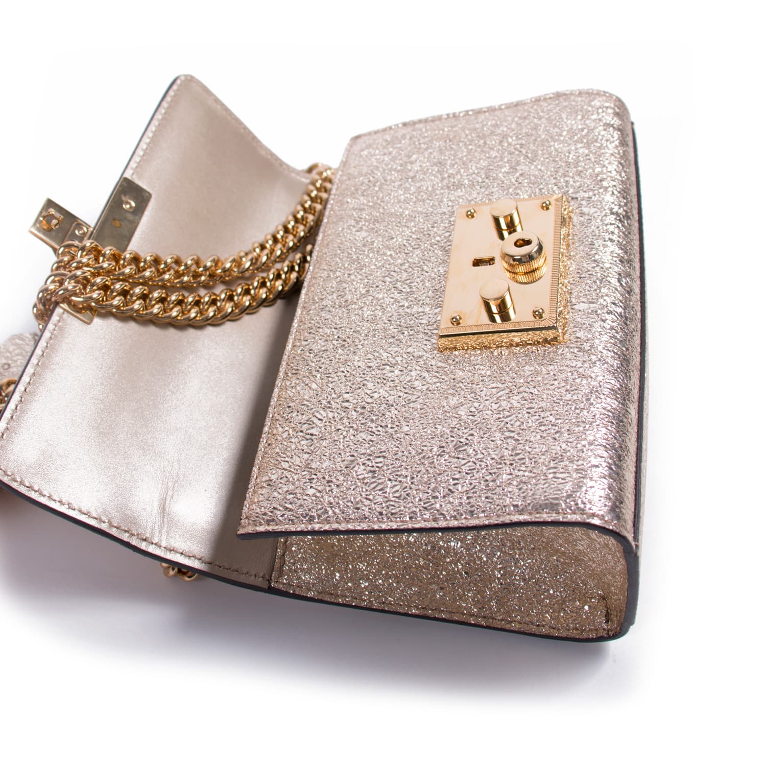 Details: Metallic Gold Leather / Gold-Tone Hardware / Chain-Link Shoulder Strap / Pocket at Exterior Back / Brown Fabric Interior Lining / Single Slit Pocket at Inside / Flap Closure with S-Lock