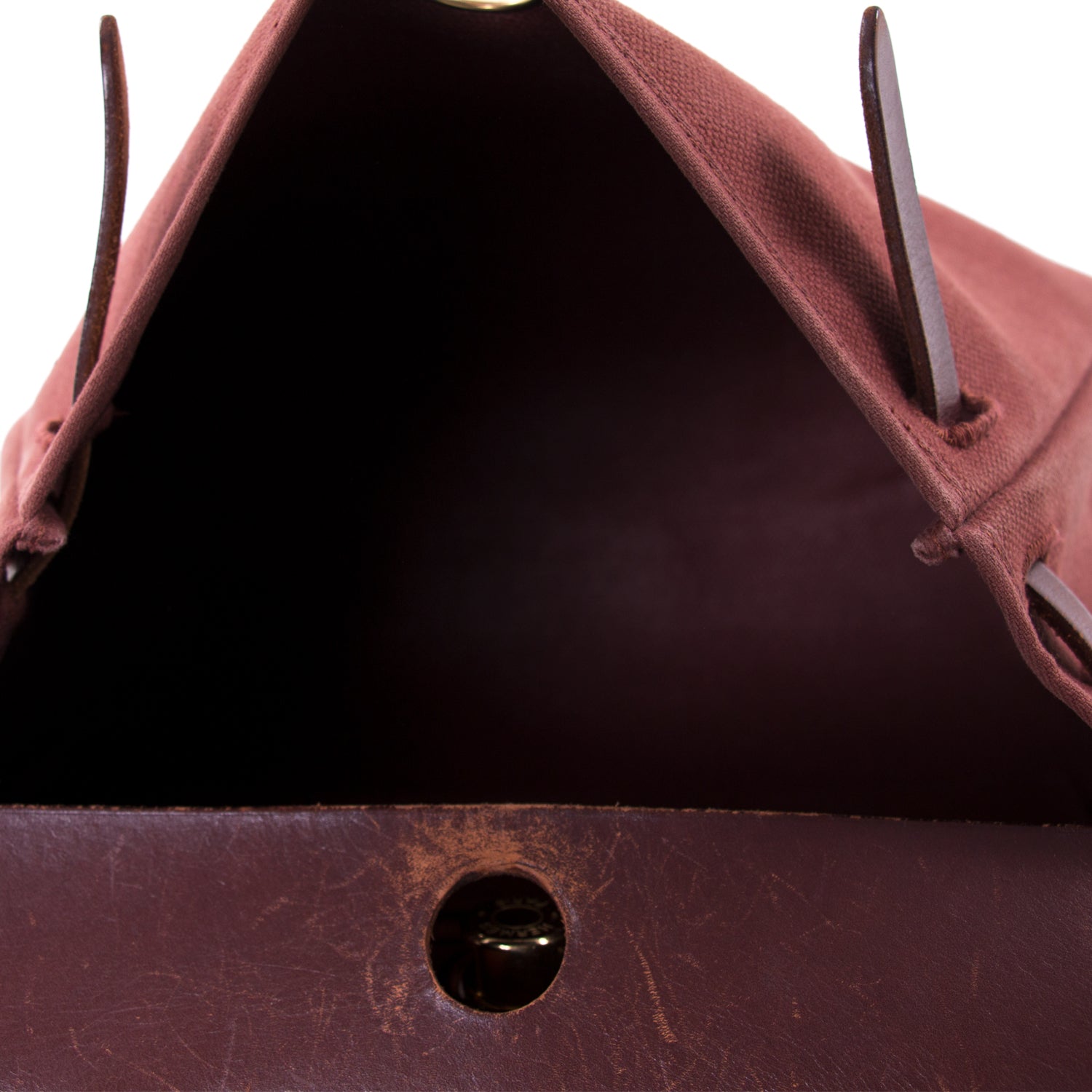 Details: Dual Interchangeable Canvas in Burgundy and Beige / Burgundy Leather Trim / Dual Rolled Handles / Detachable Shoulder Strap / Single Compartment with Flat Pocket / Pull-Through Closure at Front Flap