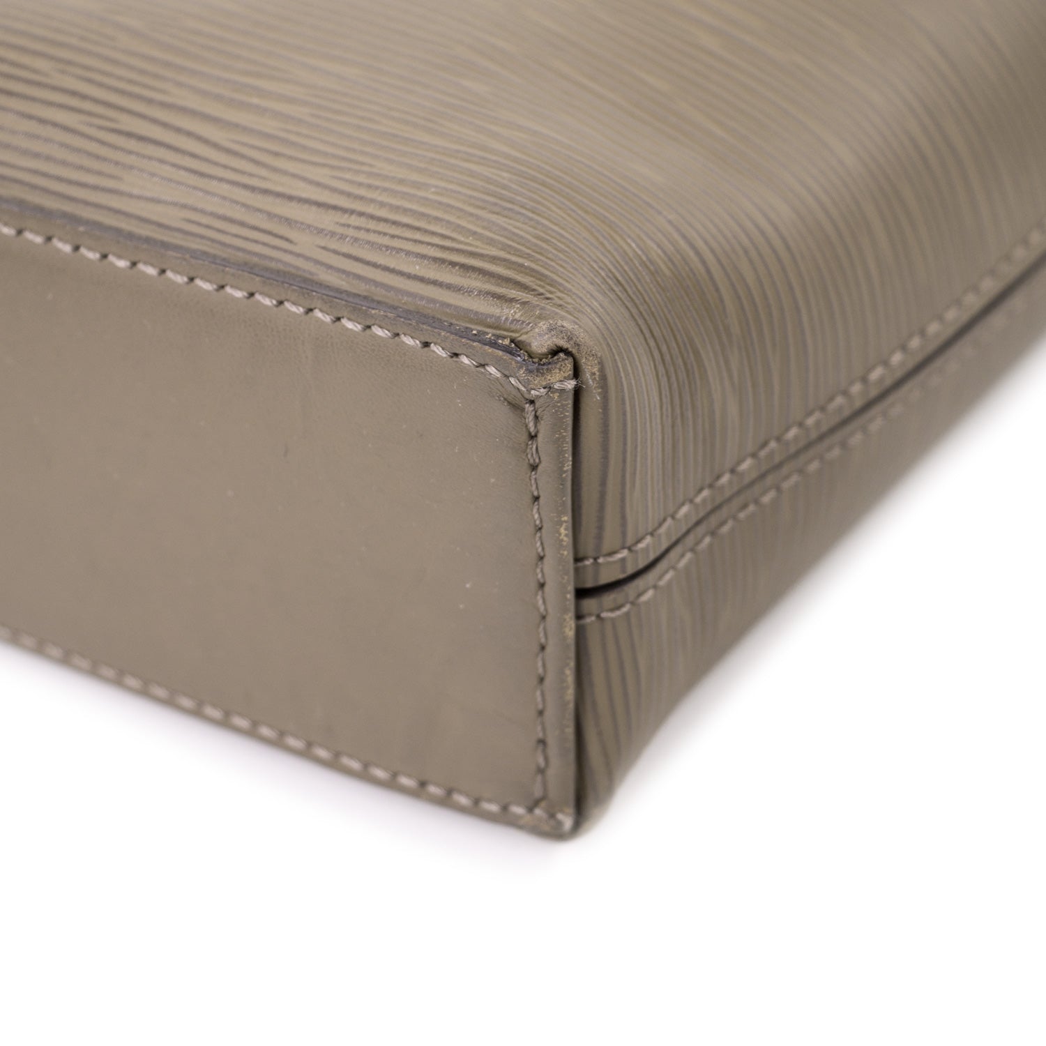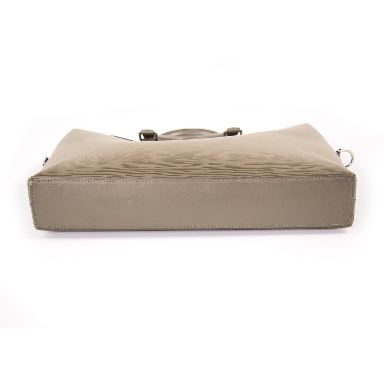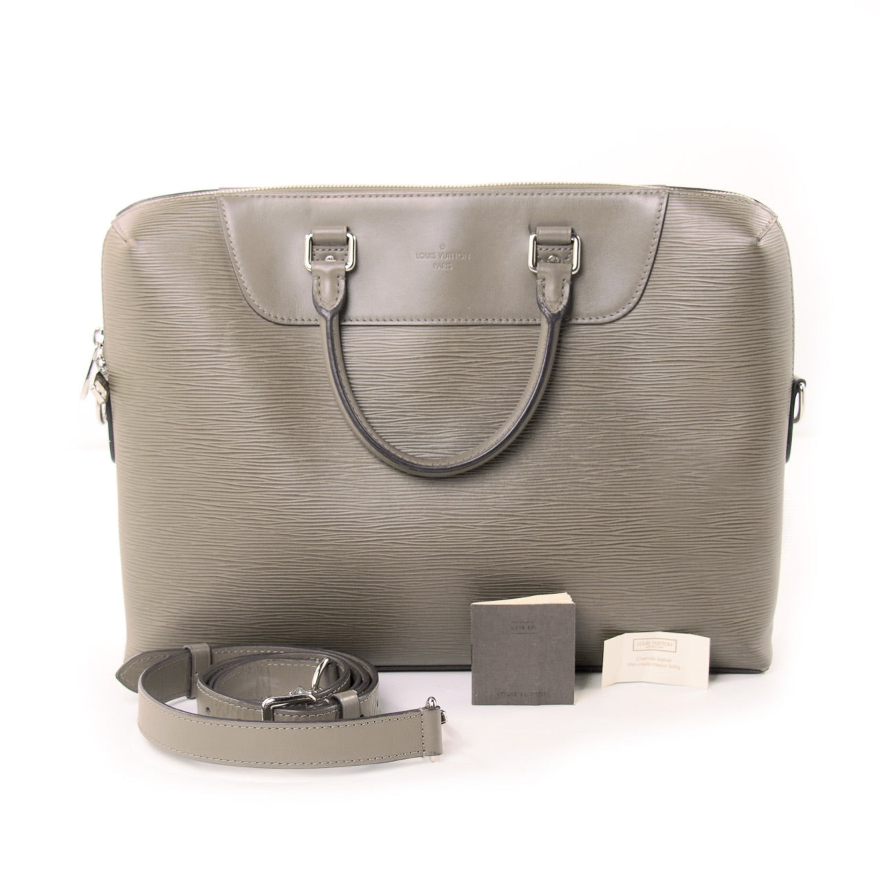 Details: Khaki Grey Epi Leather / Silver-Tone Hardware / Detachable Adjustable Shoulder Strap / Dual Rolled Leather Top Rolled Handles / Grey Suede Interior Lining / Single Large Compartment / Five Interior Flat Pockets Including One iPad-Sized / Double Pen Loop / Double Zip Closure At Top