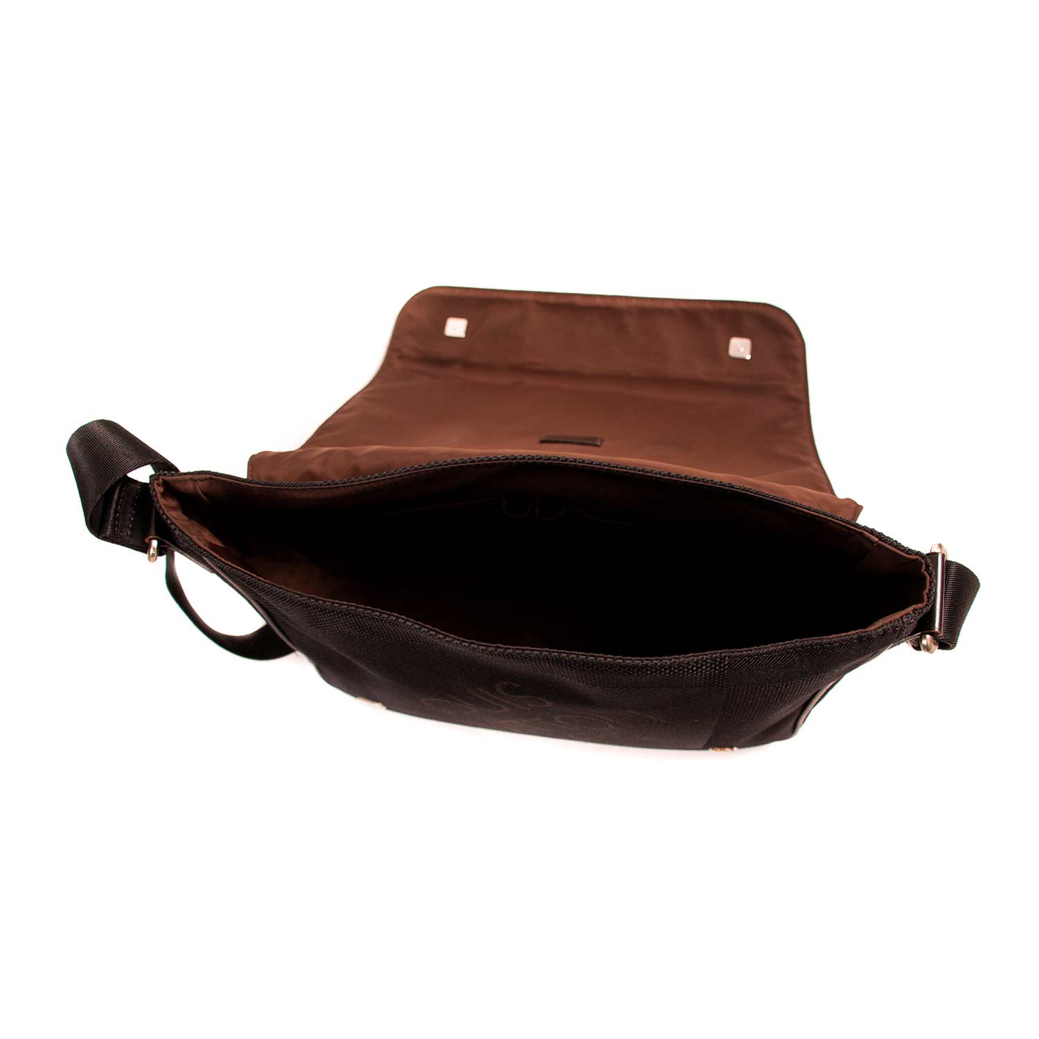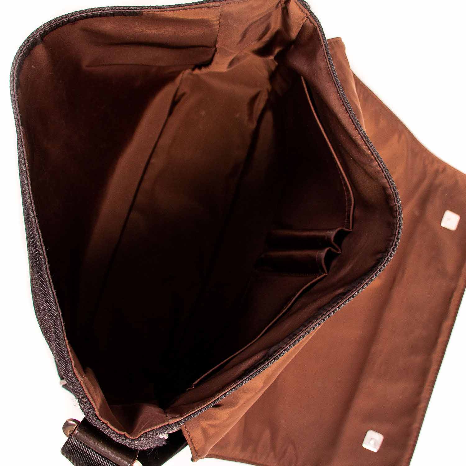 Details: Black Fabric Canvas / Silver Tone Hardware / Adjustable Shoulder Strap / Leather Trim / Exterior Zip Pocket at Back / Single Compartment / Dual Slit Pockets at Interior / Magnetic Snap Closure at Front Flap / Embossed Logo at Front