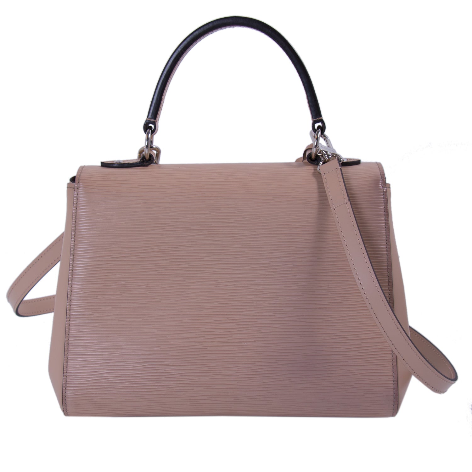Details: Rose Nacre Epi Leather / Silver-Tone Hardware / Single Rolled Handle / Detachable Shoulder Strap / Black Leather Trim / Brown Alcantara Lining / Dual Slit Pockets and One Zipper Pocket / Magnetic Closure at Front Flap