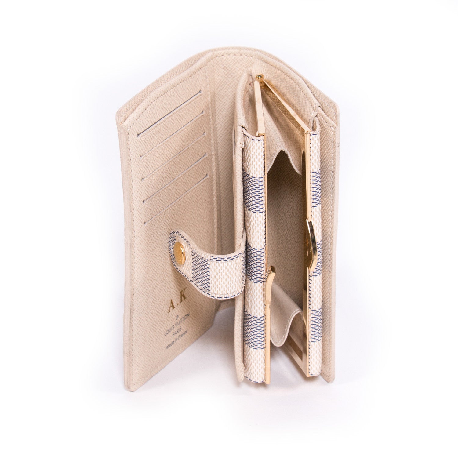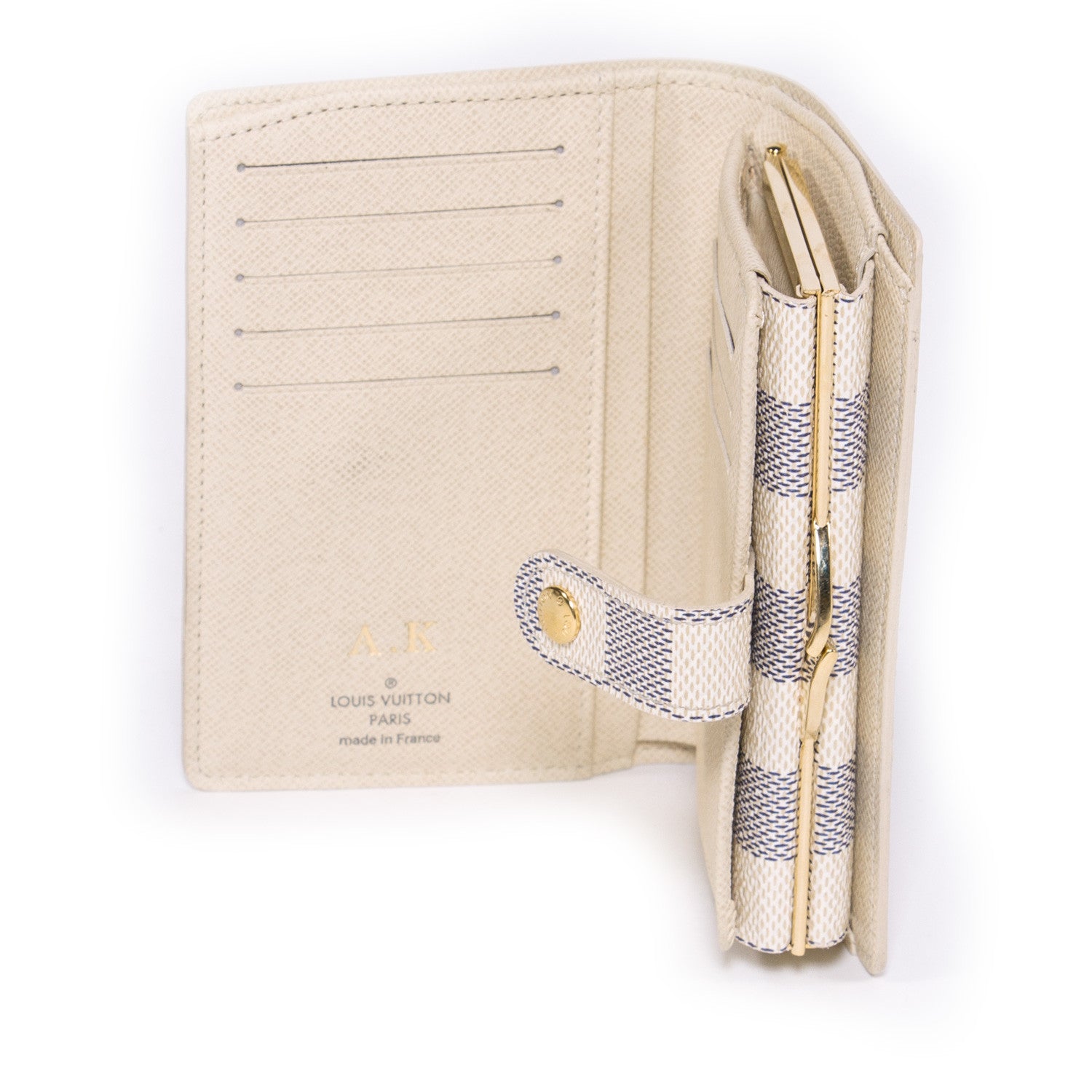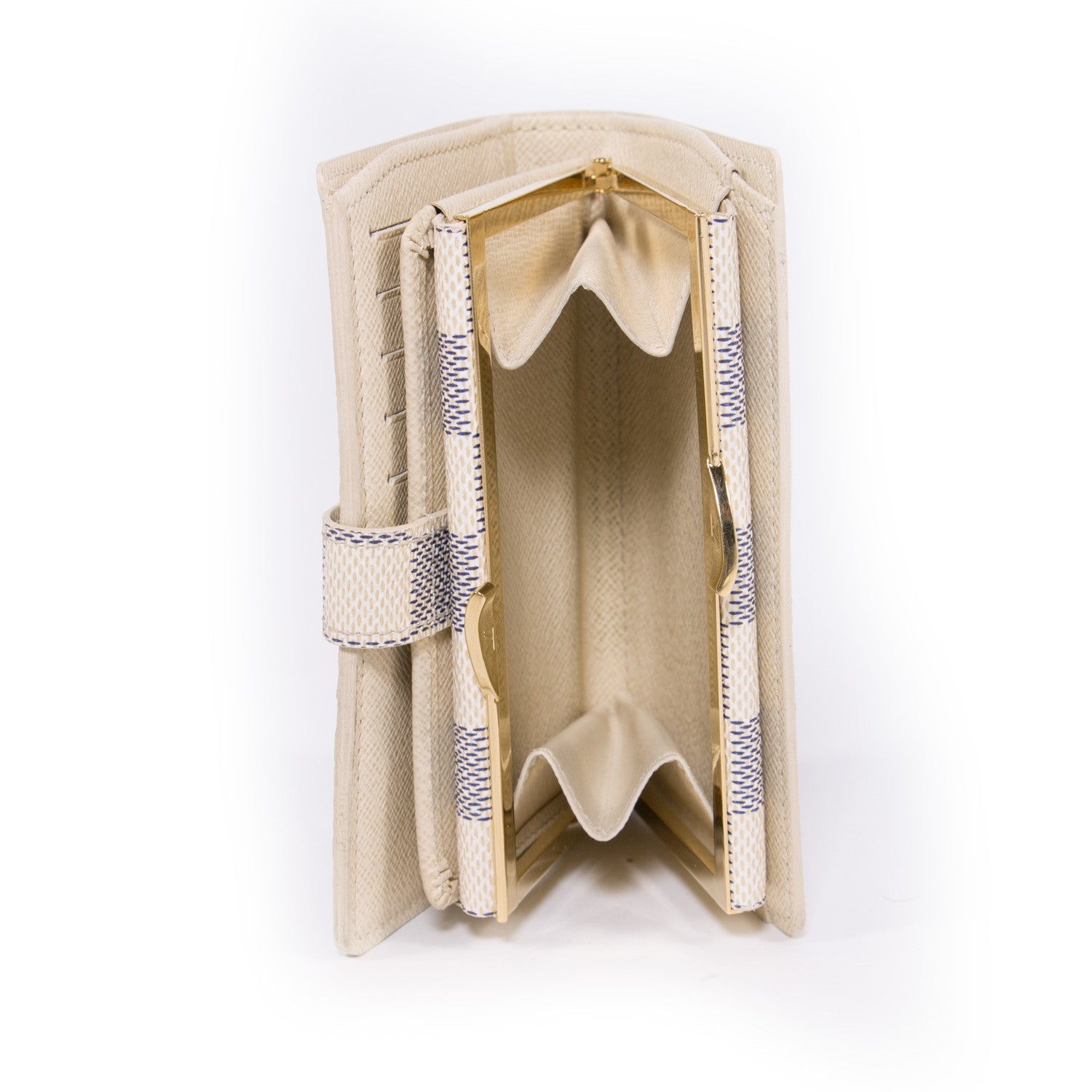 Details: White Damier Azur Coated Canvas / French Wallet Purse / Brass Gold Tone Hardware / Four Interior Card Slots / Dual Slit Pockets / Single Interior Bill Compartment / Coin Compartment Featuring Kiss-Lock Closure and Snap Button Closure.