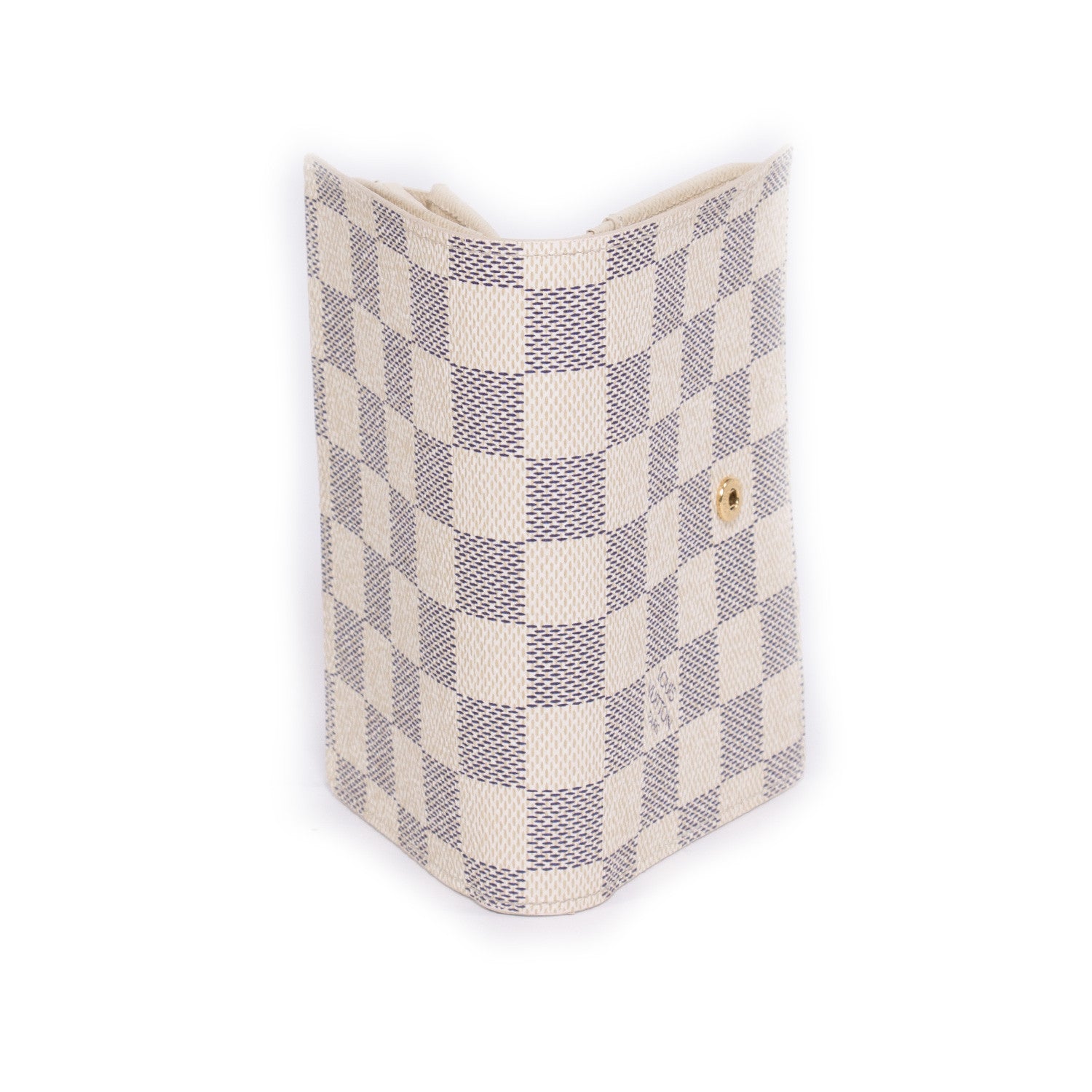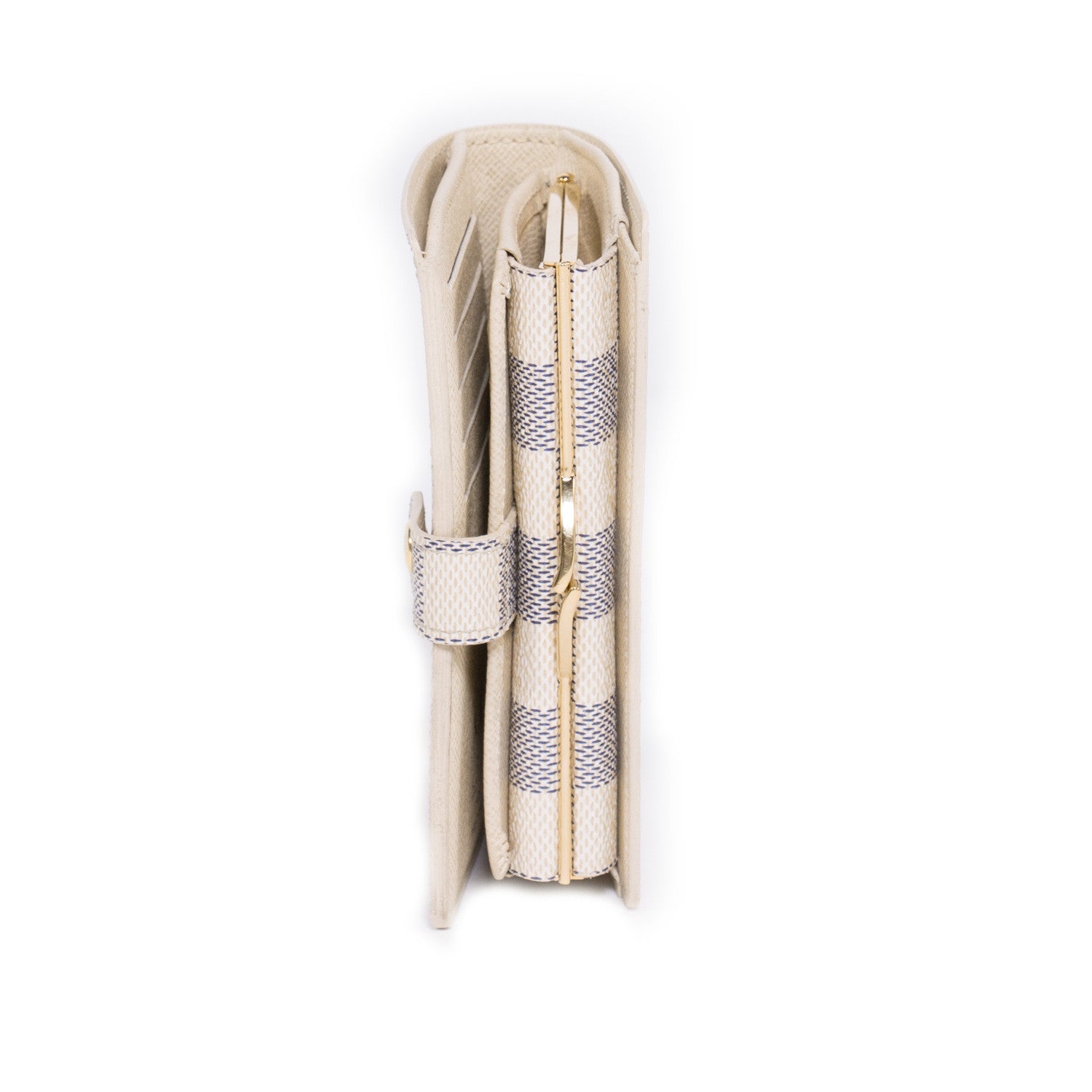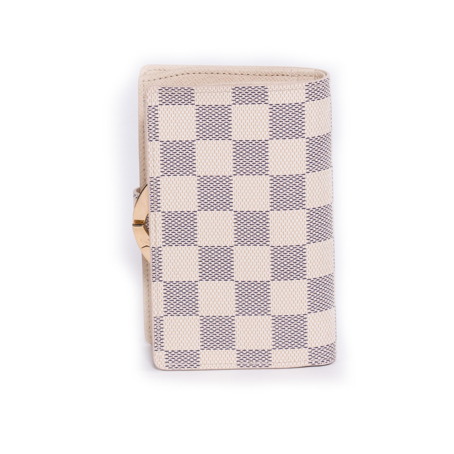 Details: White Damier Azur Coated Canvas / French Wallet Purse / Brass Gold Tone Hardware / Four Interior Card Slots / Dual Slit Pockets / Single Interior Bill Compartment / Coin Compartment Featuring Kiss-Lock Closure and Snap Button Closure.