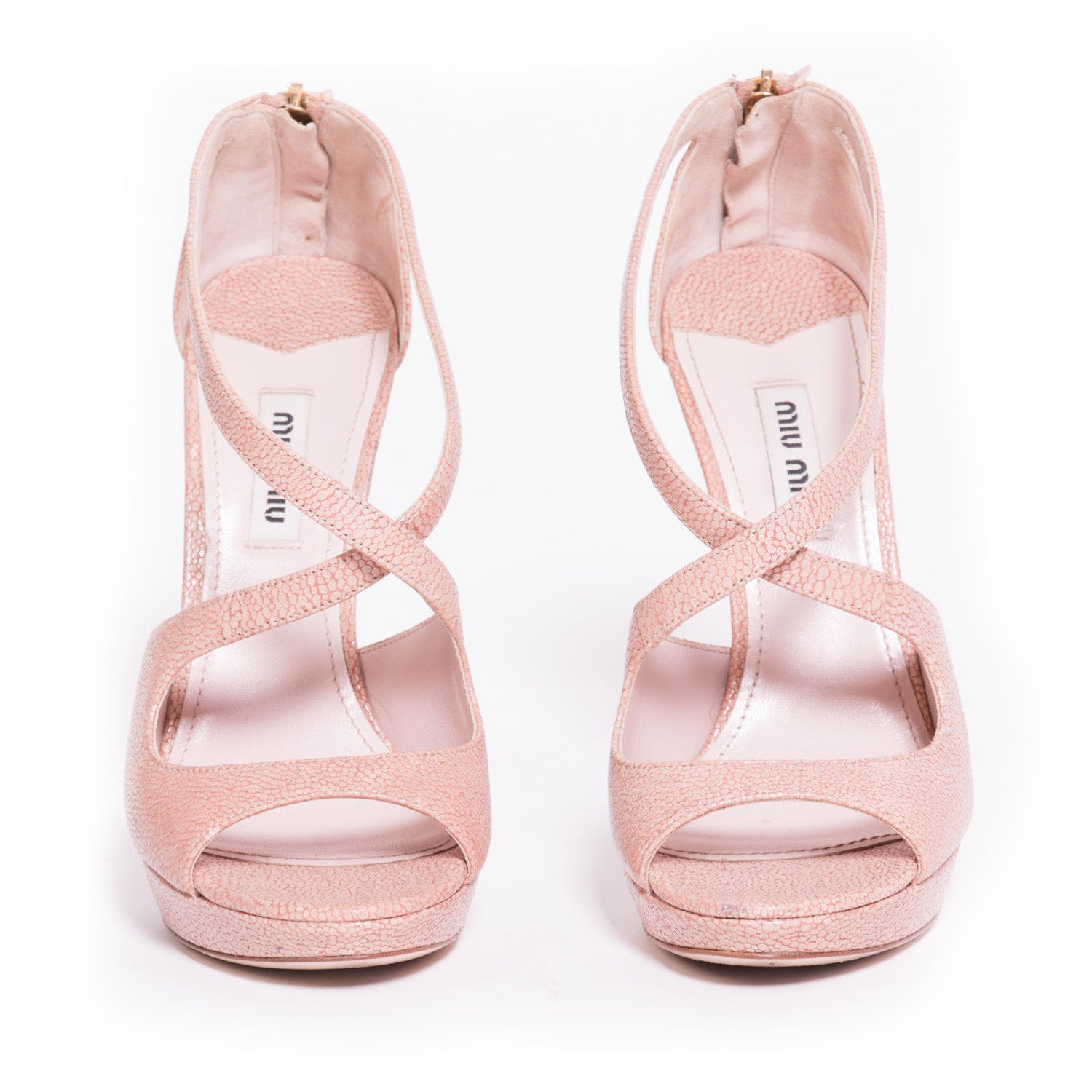 Details: Nude Color Leather / Sandals Platforms / Cross Over Straps At Front / Tonal Stitching Throughout / Cover Heels At Counter / Gold Tone Zip Closure At Counter