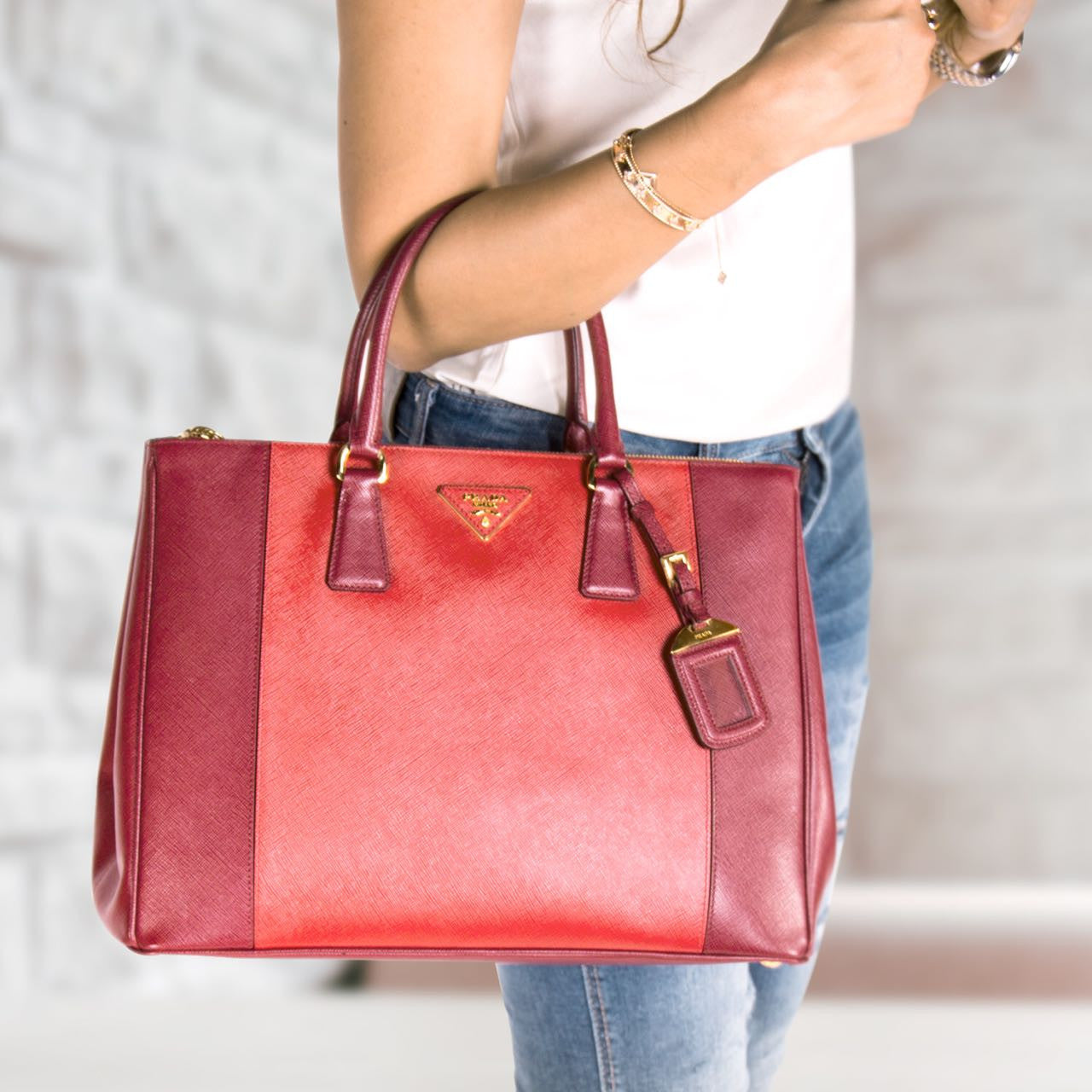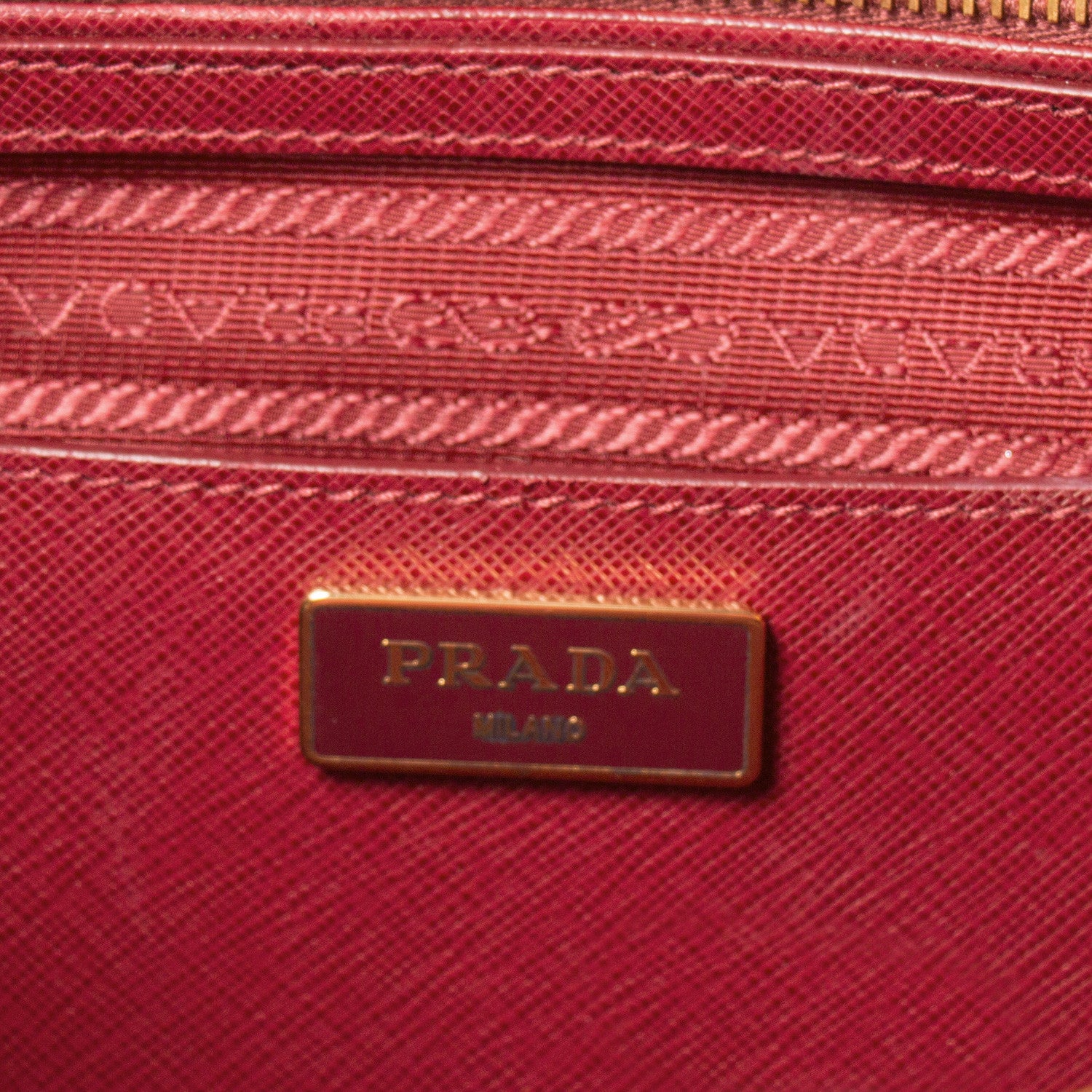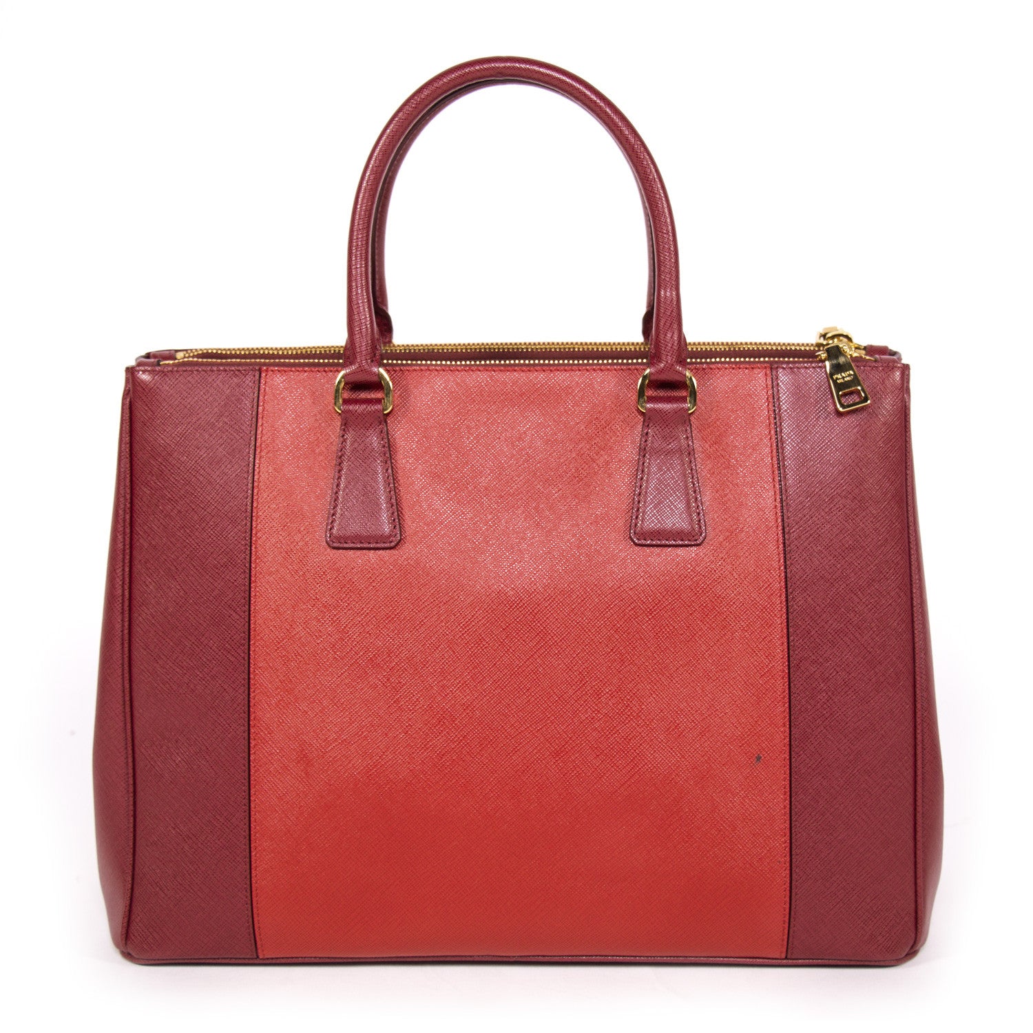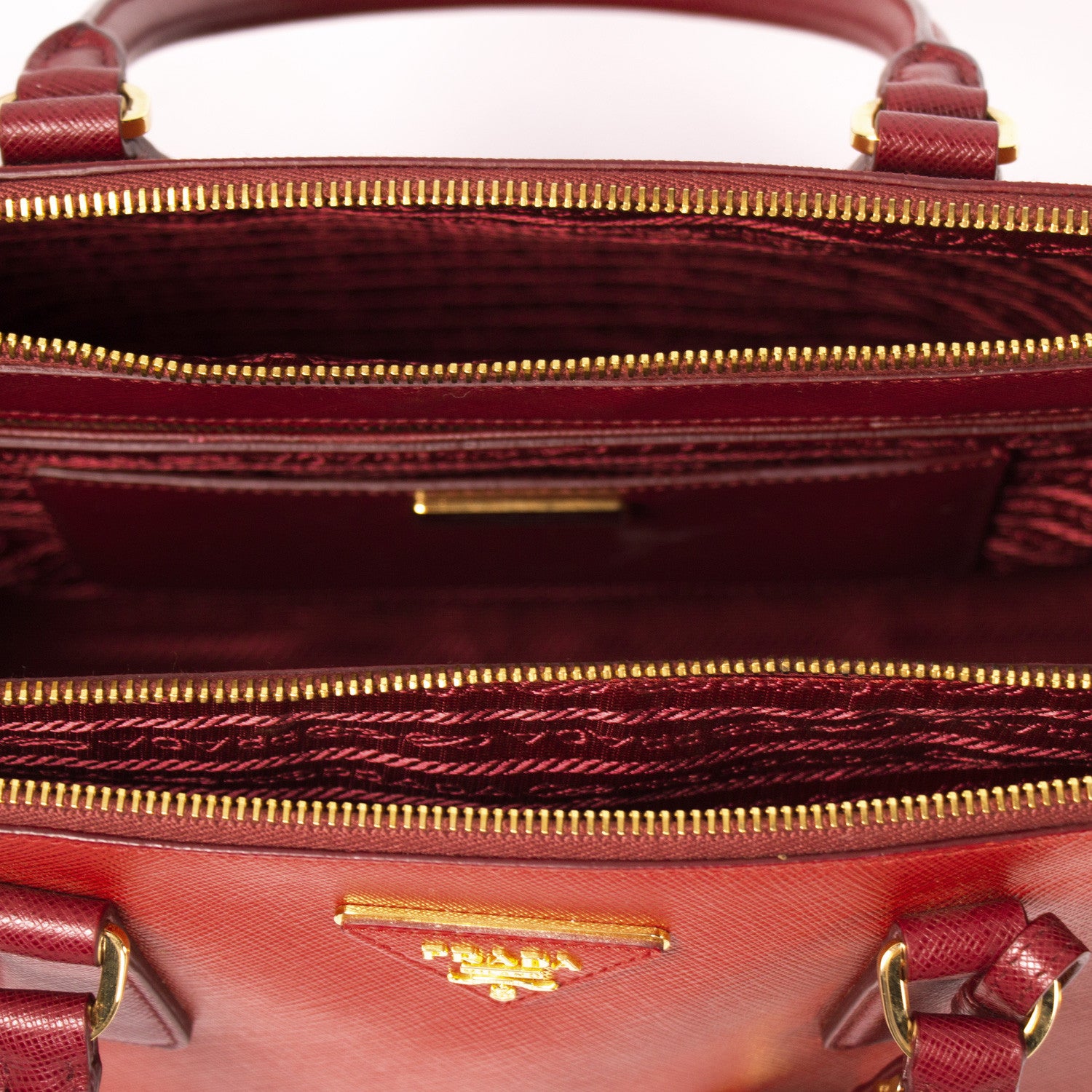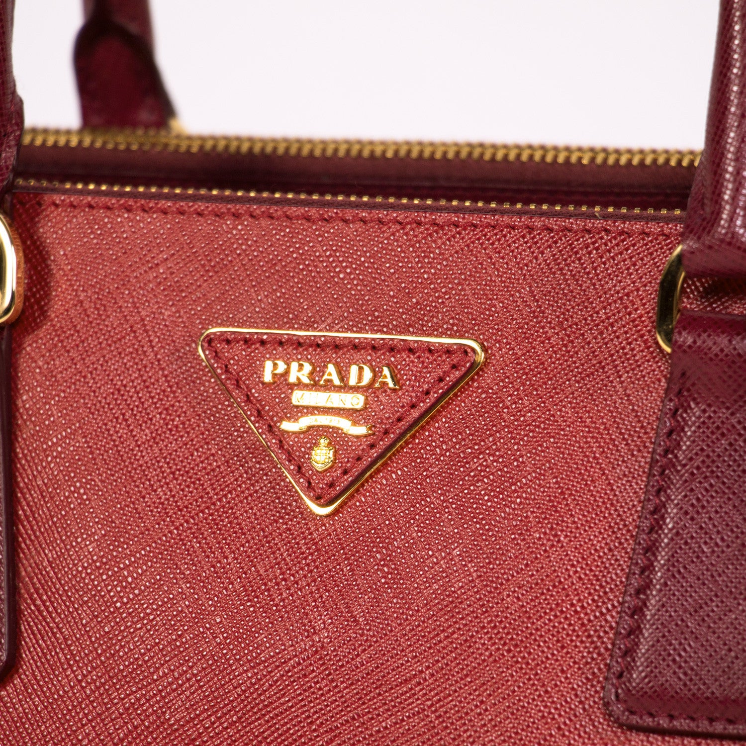 Details: Red Cerise Saffiano Leather / Gold Tone Hardware / Double Zip / Dual Rolled Handles / Logo At Front Face / Protective Studs At Base / Tonal Red Jacquard Interior Lining / Three Interior Compartments: Two With Zippers / Four Interior Pockets, One With Zip Closure