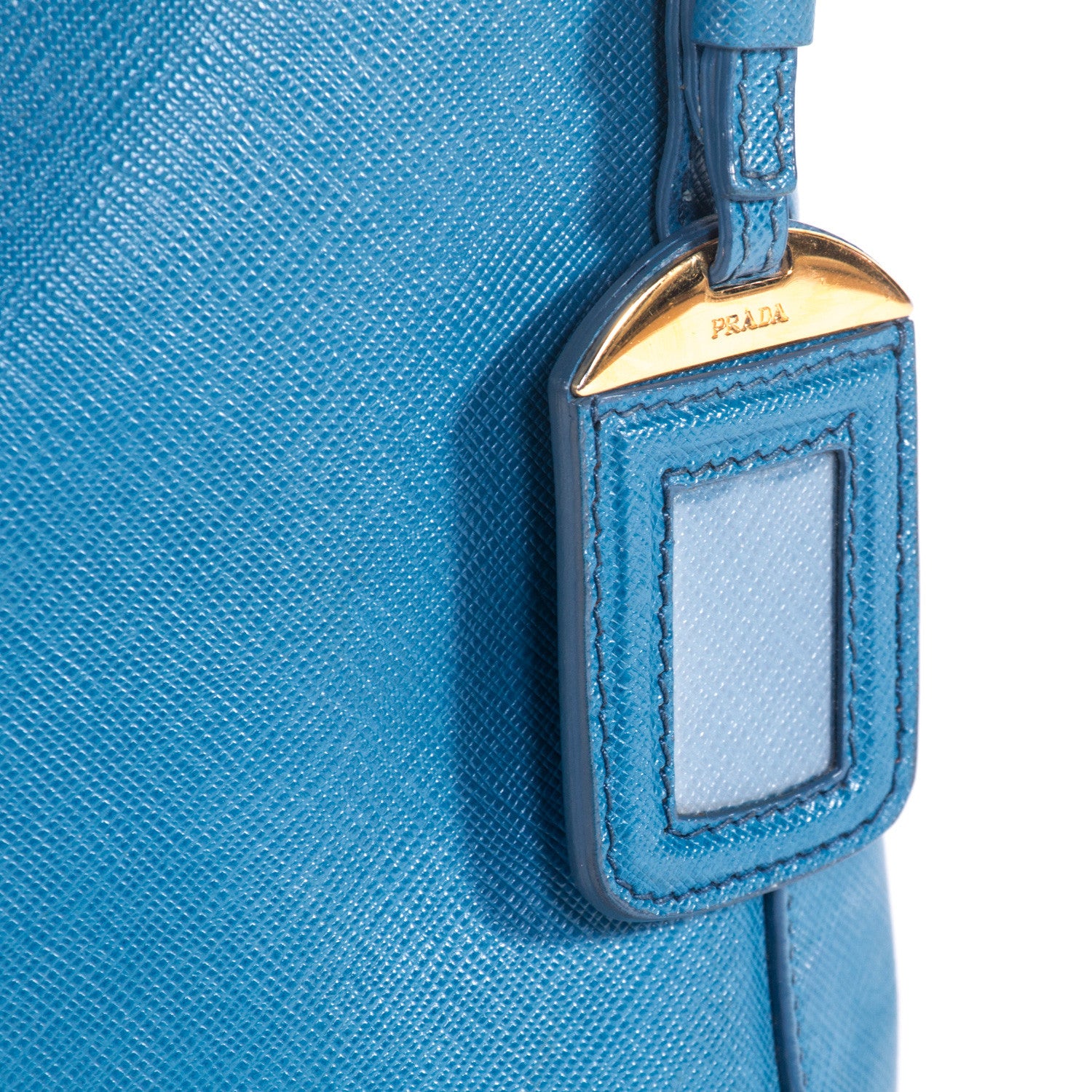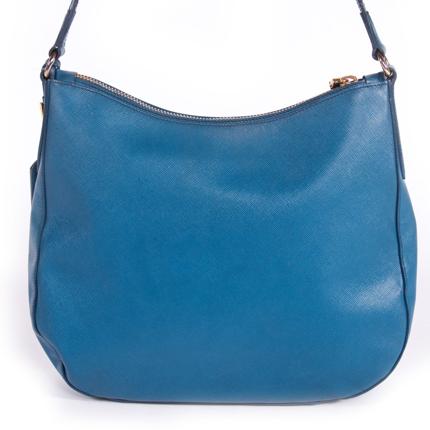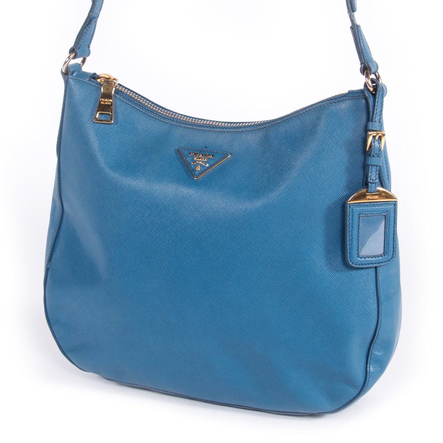 Details: Blue Leather / Gold-Tone Hardware / Single Adjustable Shoulder Strap / Luggage Name Tag Attached / Single Compartment / Dual Slit Pockets At Interior Wall / Zip Pocket At Interior / Zip Closure At Top
