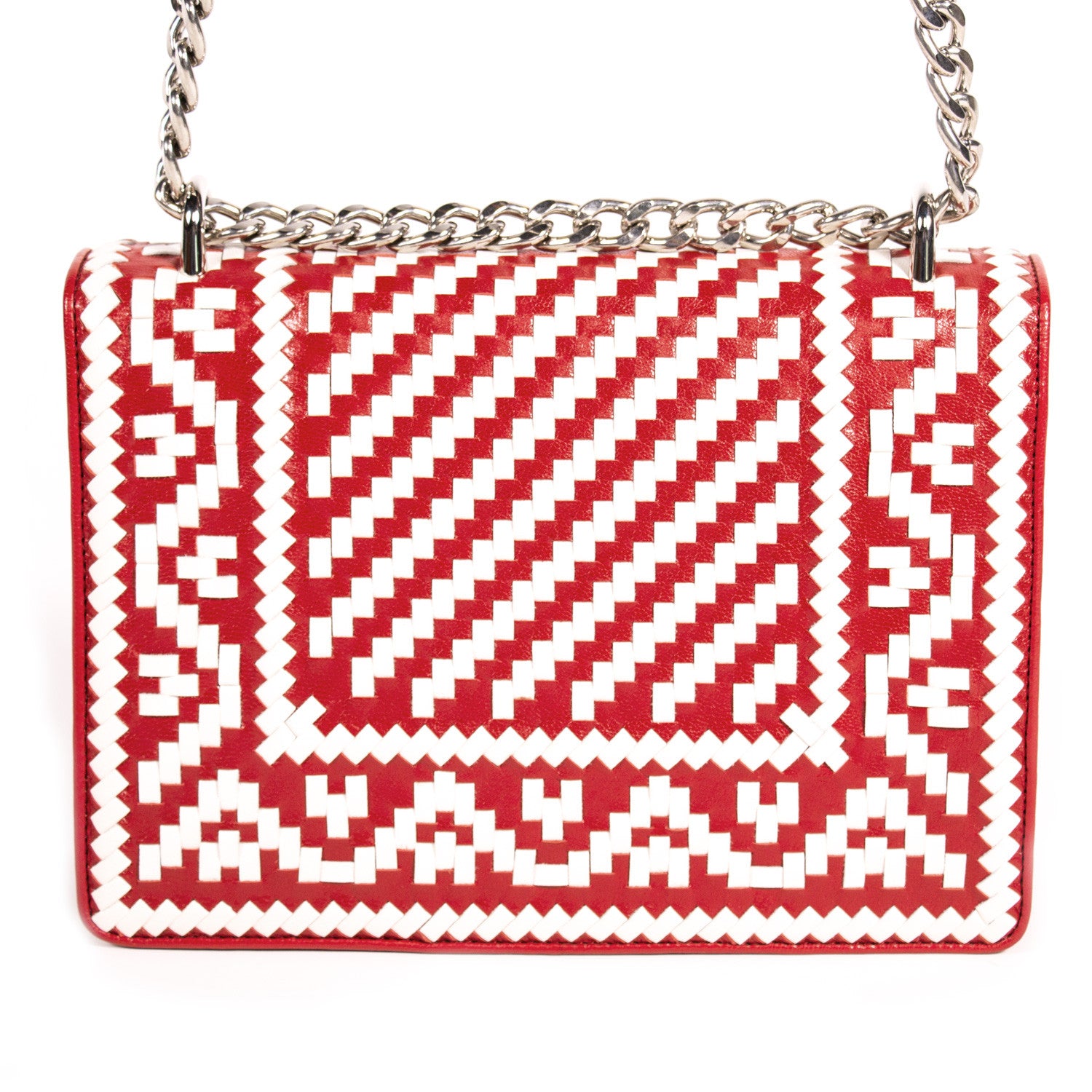 Details: White+Fire Woven Madras-Pattern Lamb Leather / Silver-Tone Hardware / Chain-Link Shoulder Strap With Leather Accent / Red Napa Leather Interior Lining / Single Compartment / Dual Pockets At Wall One With Magnetic Snap Closure / Flap Top With Front Lock Clasp.