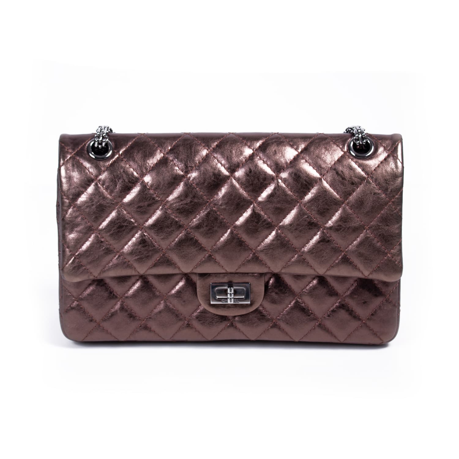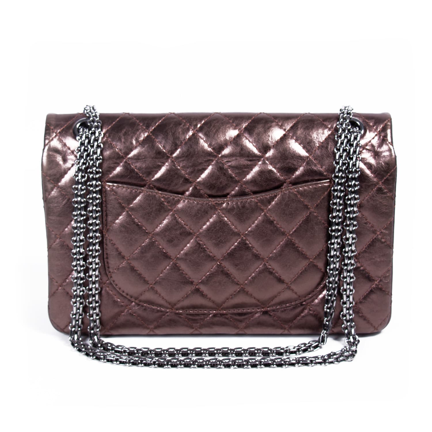 Details: Bronze Aged Calfskin Leather / Brushed Hardware / Chain-Link Shoulder Strap / Exterior Pocket at Back / Leather Lining / Dual Flat Pockets at Zipper Pocket at Insider Flap / Dual Flap with Button and Turn-Lock Closure