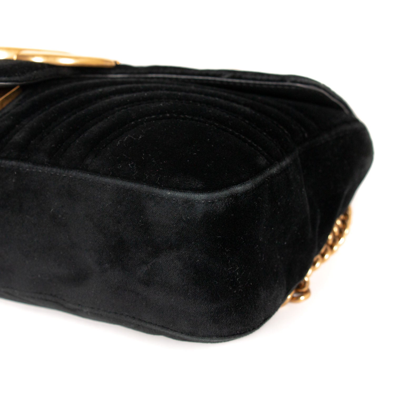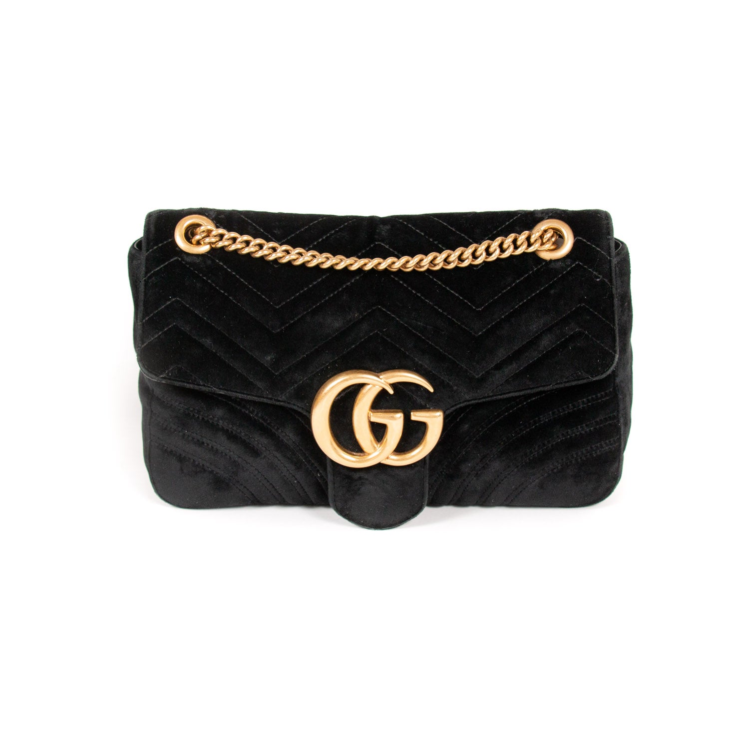 Details: Black Quilted Chevron Velvet / Gold-Tone Hardware / Chain-Link and Leather Pad Shoulder Strap / Double G Logo at Front / Satin Interior Lining / Zipper Pocket at Inside / Push Button Flap Closure at Top