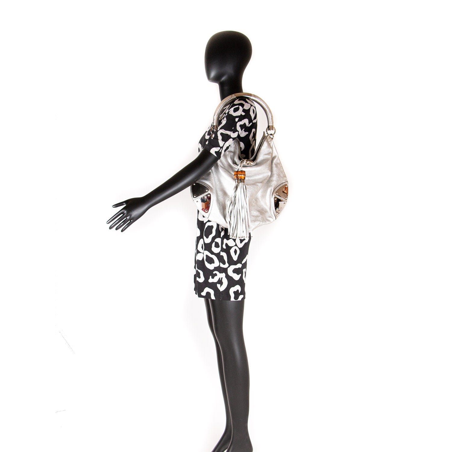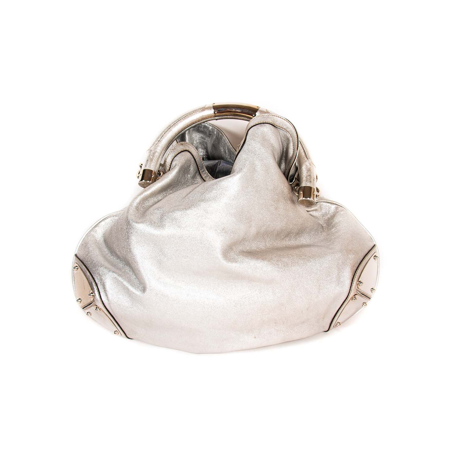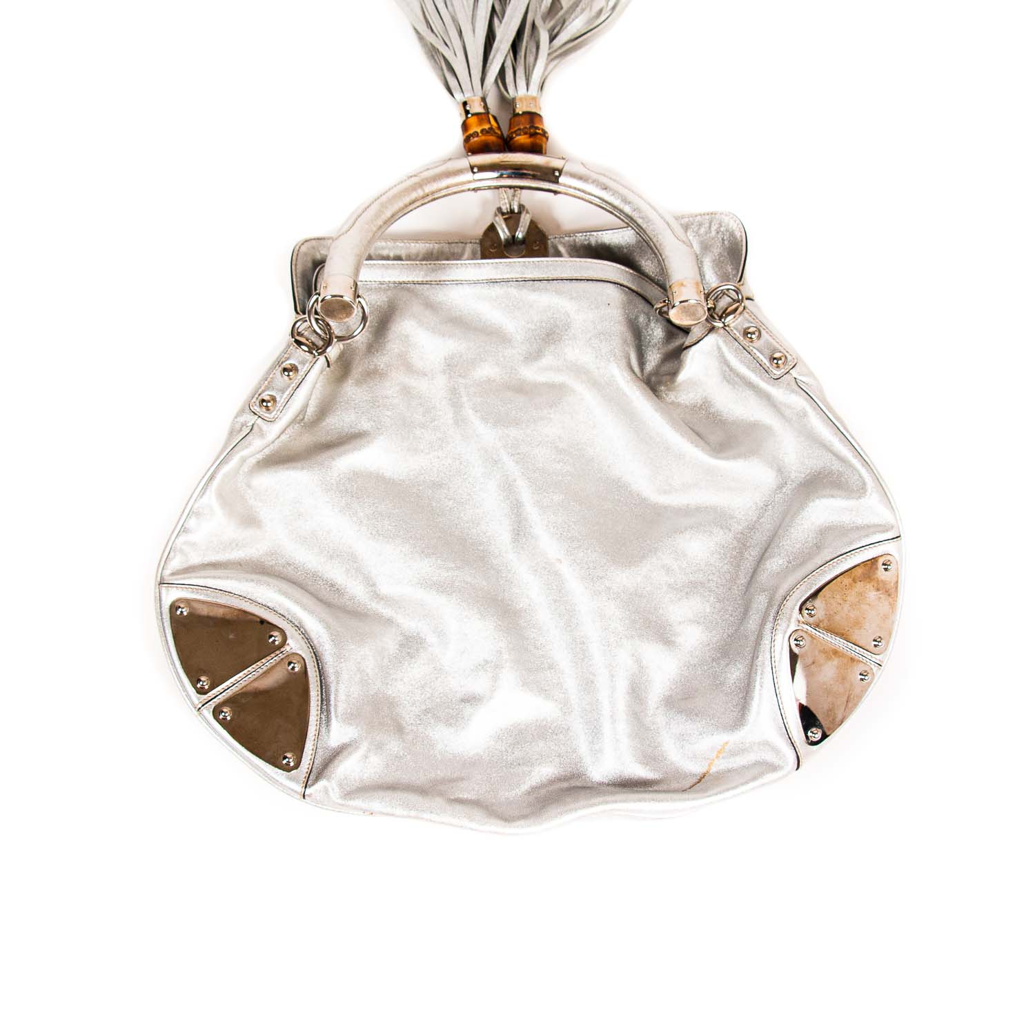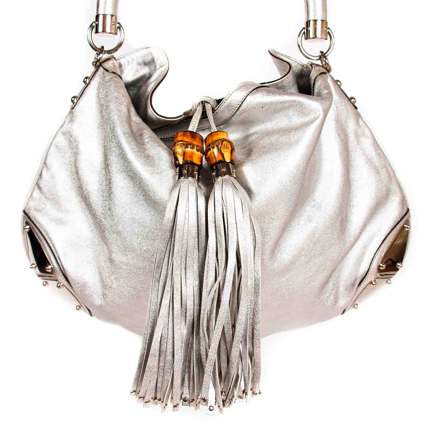 Details: Silver Metallic Leather / Silver-Tone Hardware / Single Rolled Handle / Green Printed Canvas Lining / Single Compartment / Zipper and Phone Pocket at Interior Wall / Front Flap Closure Featuring Bamboo and Tassel Adornment