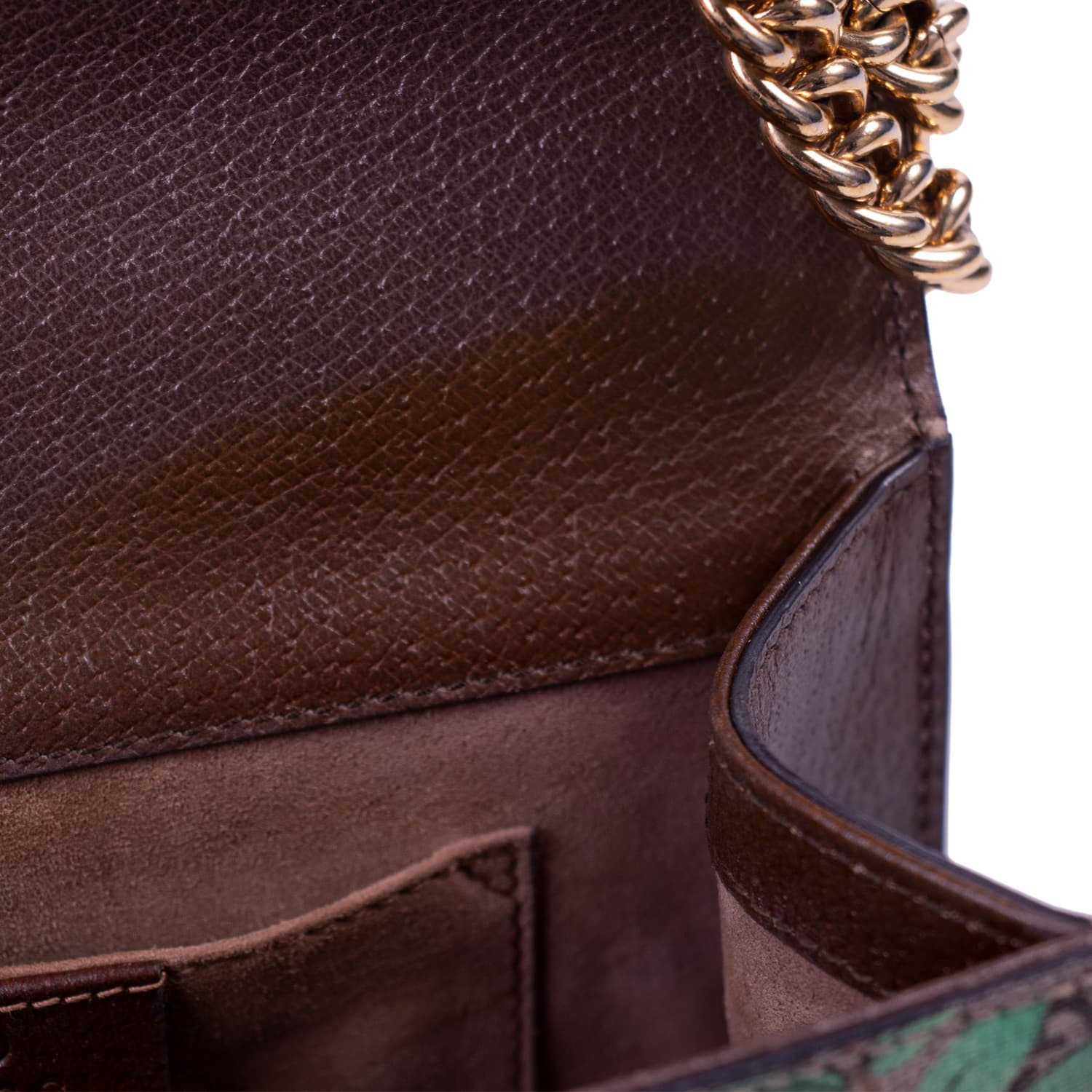 Details: Multicolor Ebony Coated Canvas / Gold-Tone Hardware / Chain Shoulder Strap / Brown Leather Trim at Sides / Brown Suede Lining / Single Compartment and Slit Pocket At Interior / Push-Button Closure at Front Flap