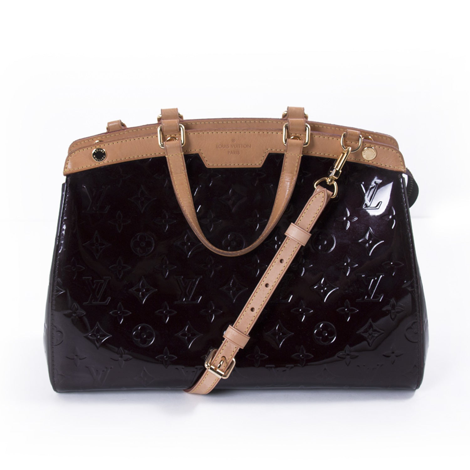 Details: Amarante Monogram Vernis Patent Leather/ Gold Tone Hardware / Dual Handles / Detachable and Adjustable Shoulder Strap / Vachetta Leather Trim / Fabric Lining / Dual Slit Pockets and Zipper Pocket at Inside / Zip Closure at Top