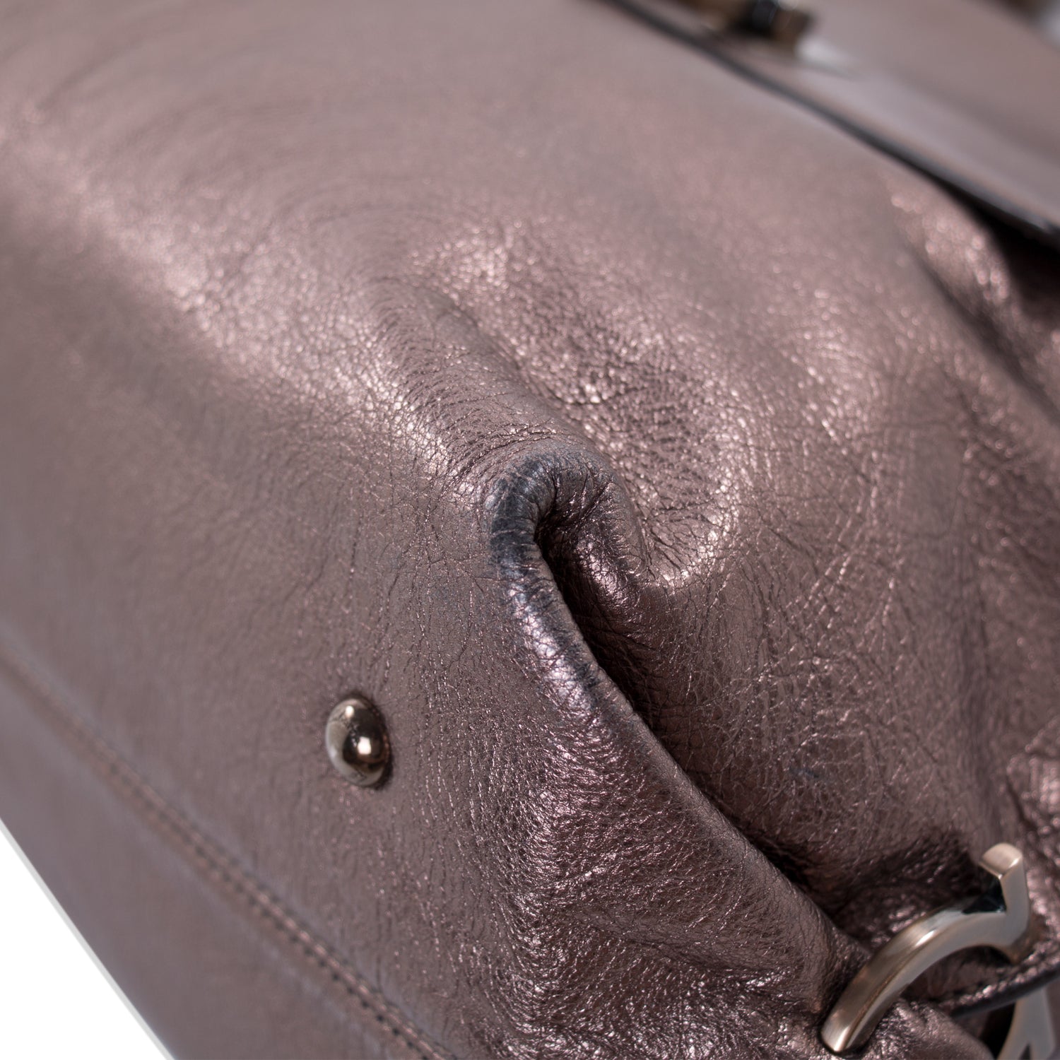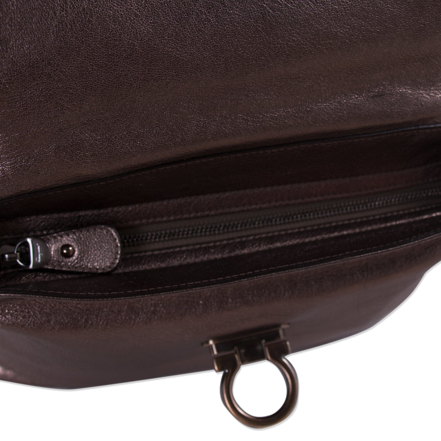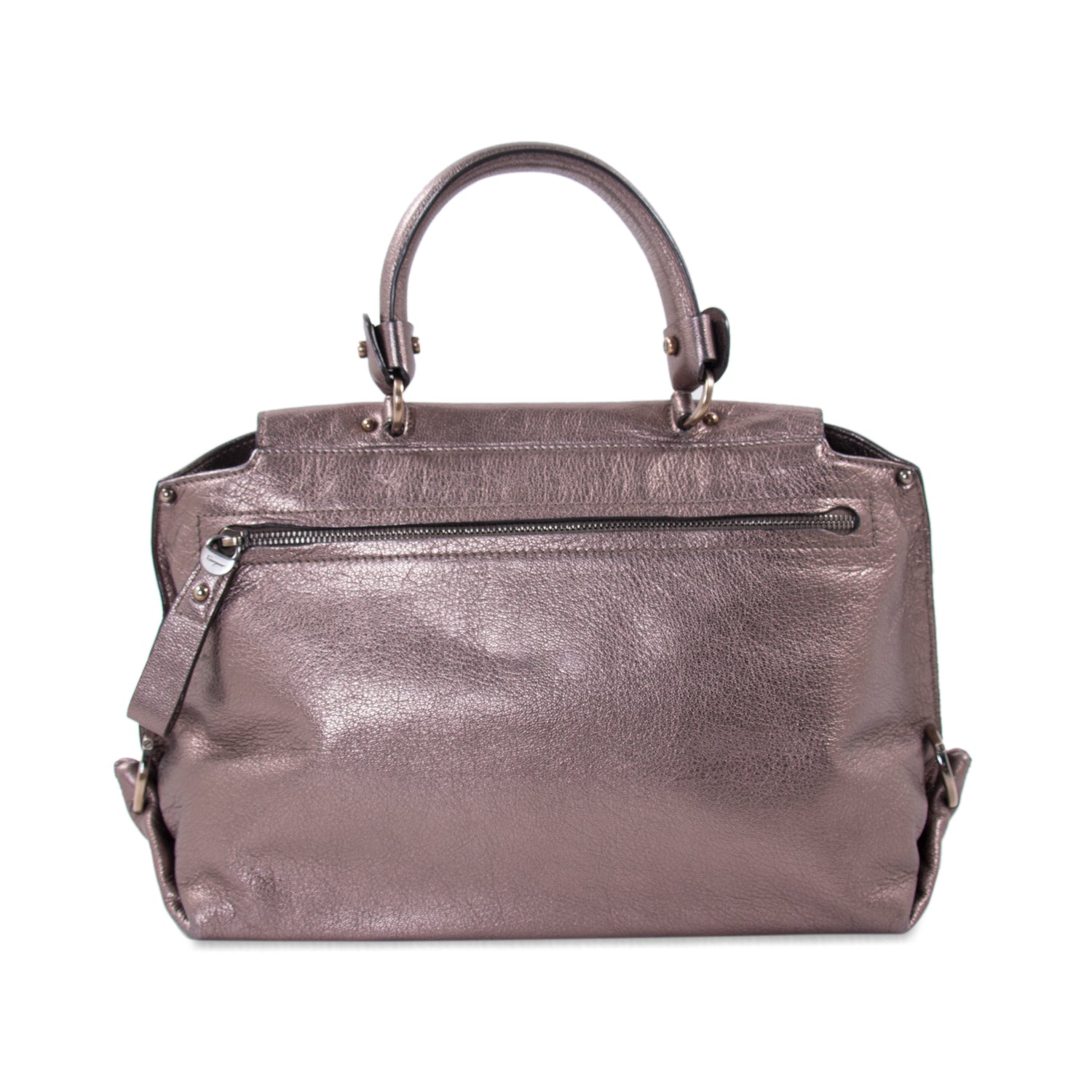 Details: Bronze Metallic Leather / Brushed Metal Hardware / Top Handle / Detachable Shoulder Strap / Fabric Lining / Dual Slit Pockets and One Zipper Pocket at Inside / Gancio Flip-Lock Flap Closure