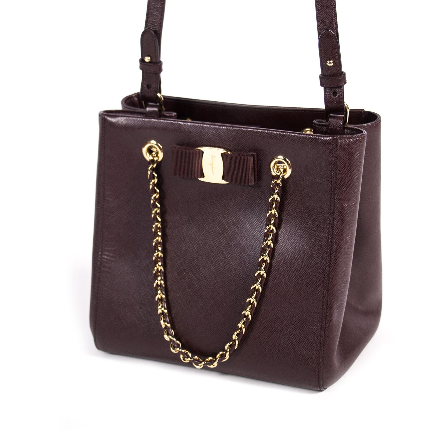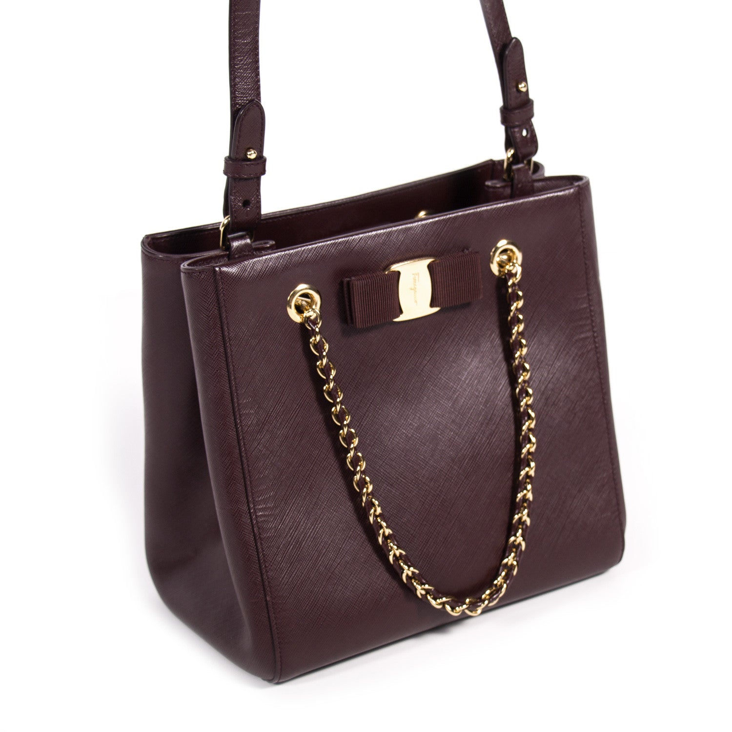 Details: Burgundy Leather / Gold Tone Hardware / Dual Chain-Link And Leather Handles / Single Shoulder Strap / Protective Studs At Base / Bow Embellishment At Front / Burgundy Satin Lining At Interior / Single Compartment / Dual Zip Pockets At Interior Walls