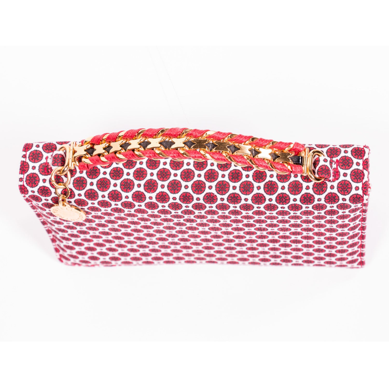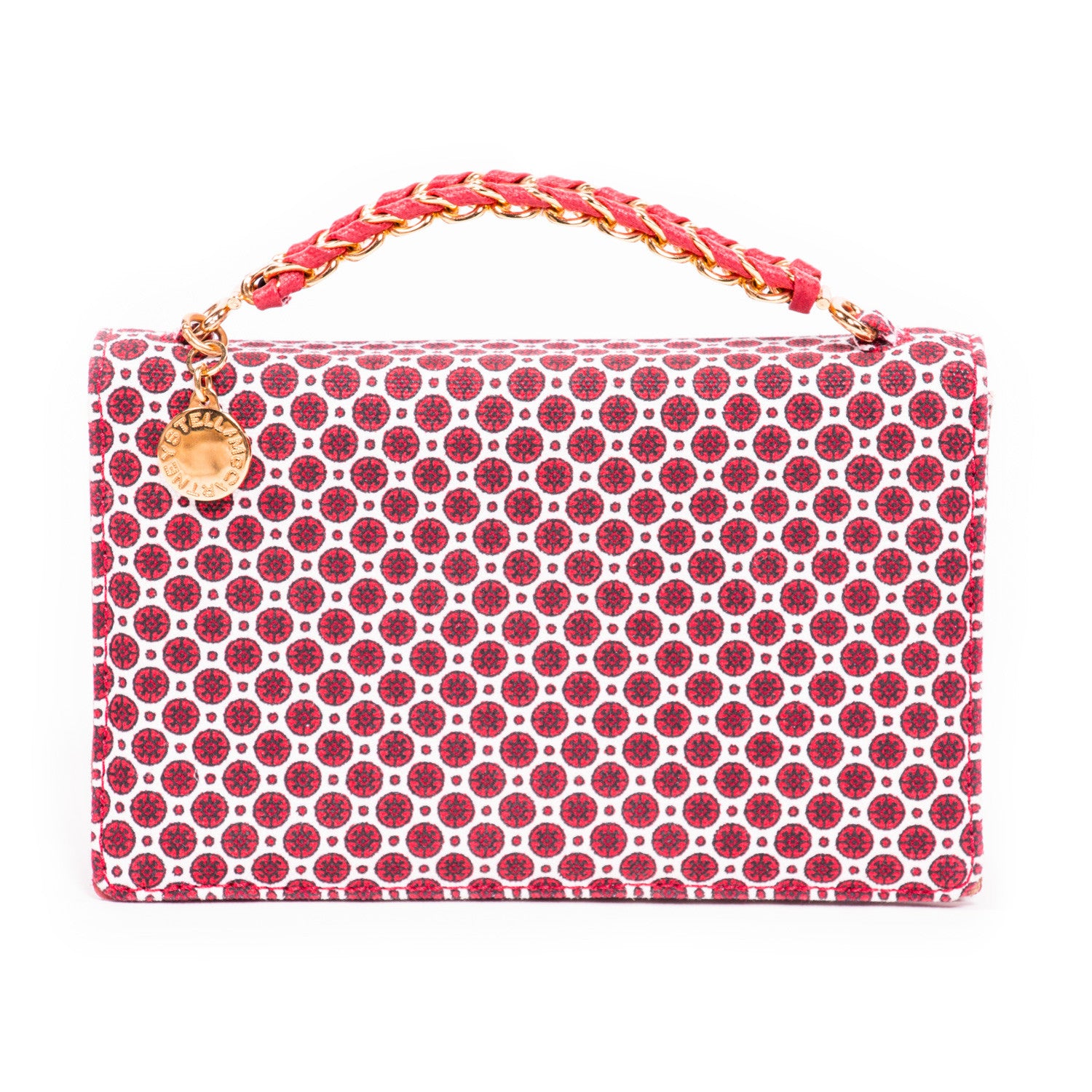 Details: Red and White Canvas / Prints Throughout / Vegan Leather Trim / Gold-Tone Hardware / Single Rolled Handle / Designer Charm At Front / Red Leather At Interior Flap / Black Interior Woven Lining / Single Flat Pocket At Interior / Concealed Snap Closure at Flap