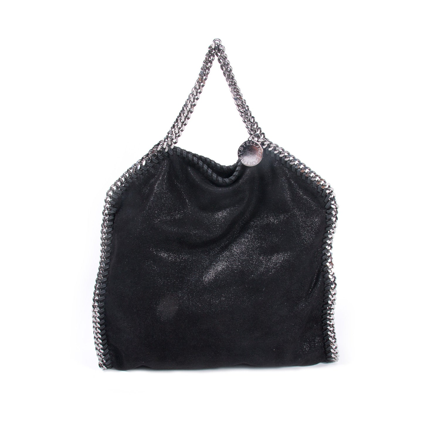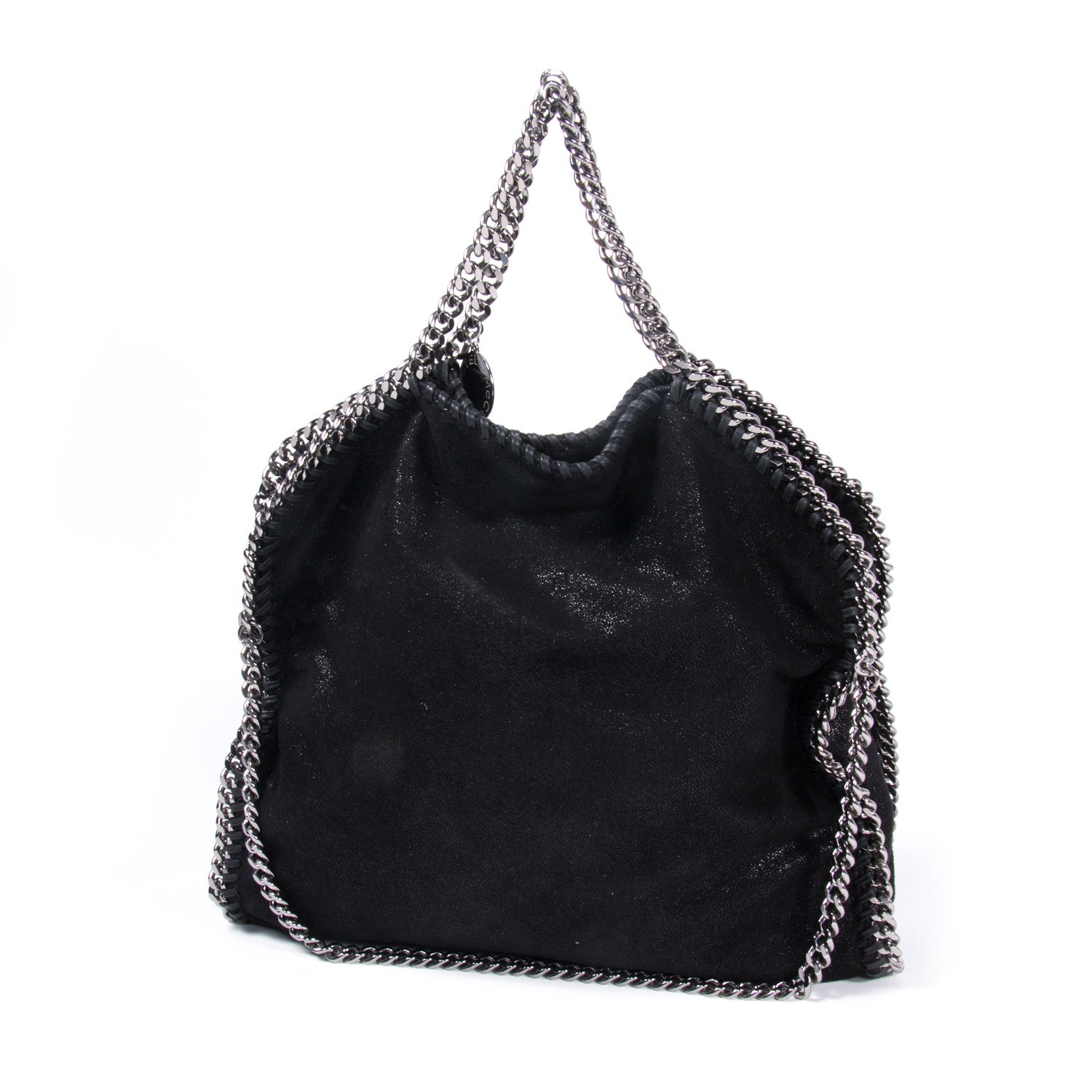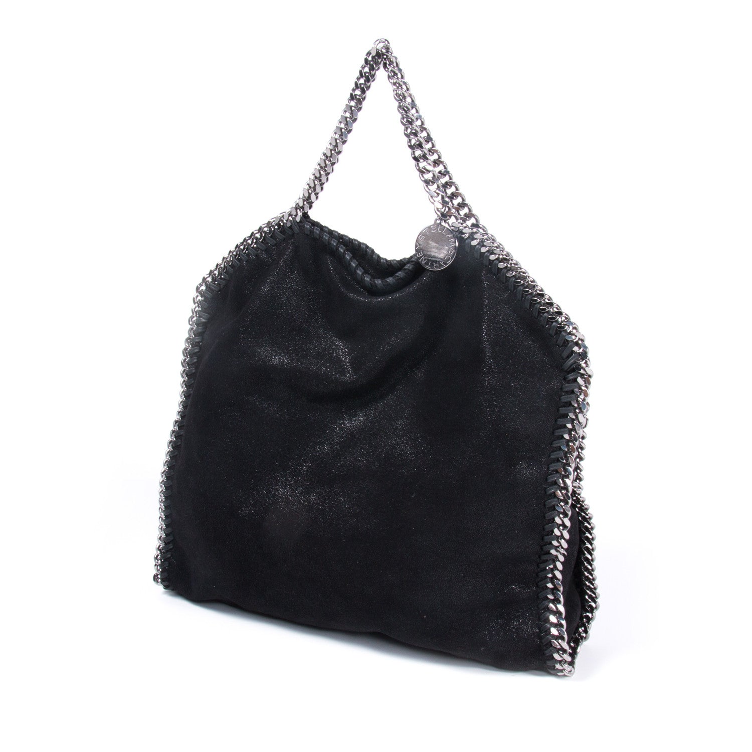 Details: Black Shaggy Deer Vegan Leather / Fold-Over Tote Bag / Silver Metal Gunmetal Hardware Chain / Shoulder Strap With Dual Handles In Metal With Chain Accent / Chain Metal At Perimeter / Beige Interior Woven Printed Lining With Large Single Compartment / Single Zip Pocket At Interior Wall / Magnetic Snap Closure At Top / Metal Engraved Logo