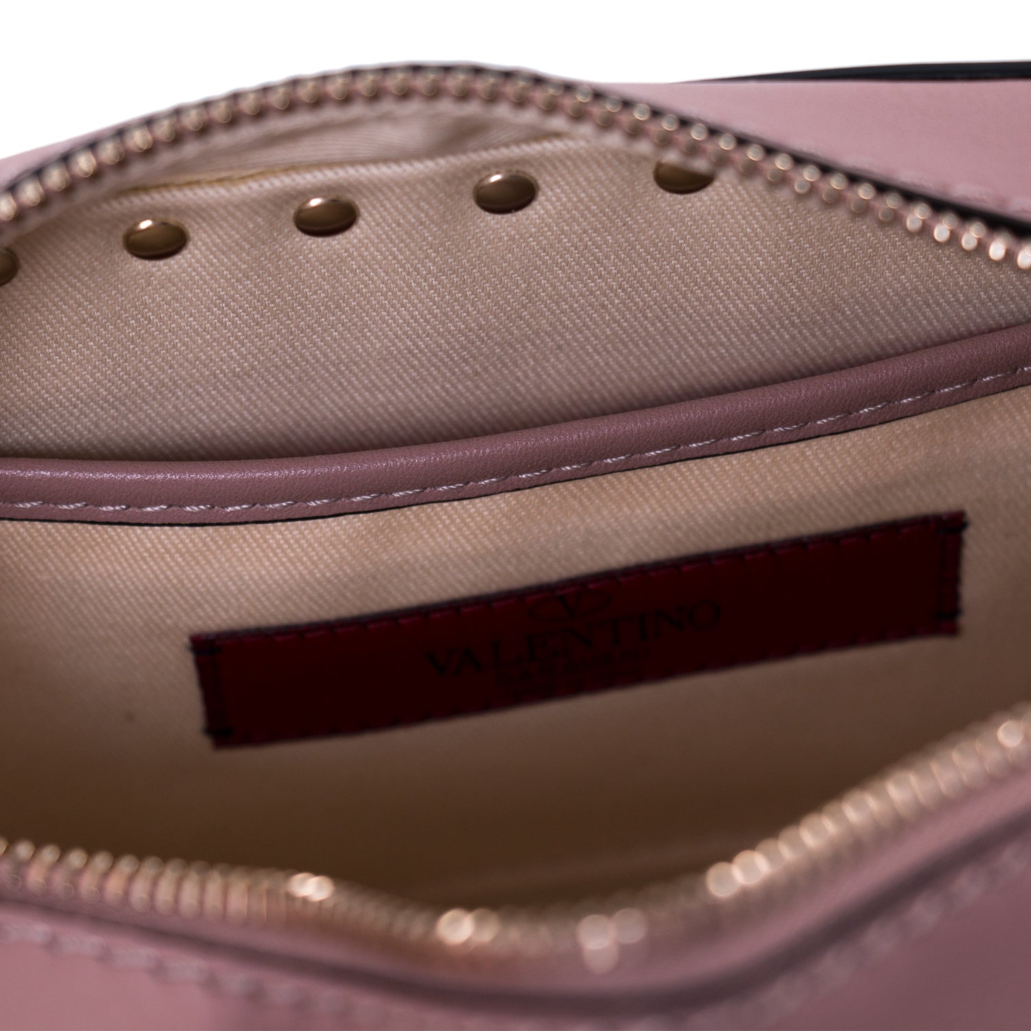 Details: Poudre Calf Leather / Gold-Tone Hardware / Adjustable Long Shoulder Strap / Stud-Embellishments Throughout and on the Shoulder Strap / Logo at Front Face / Beige Canvas Lining at Interior / Single Flat Pocket / Zipper Closure at Top