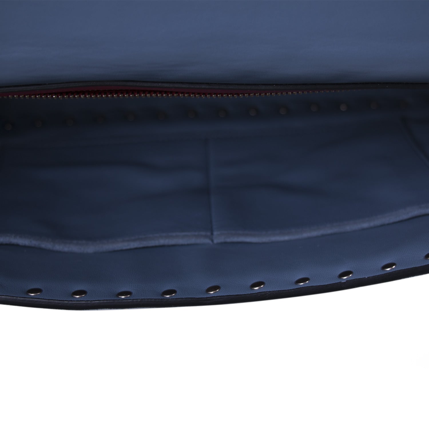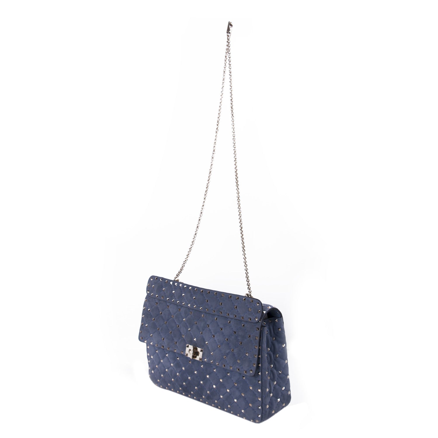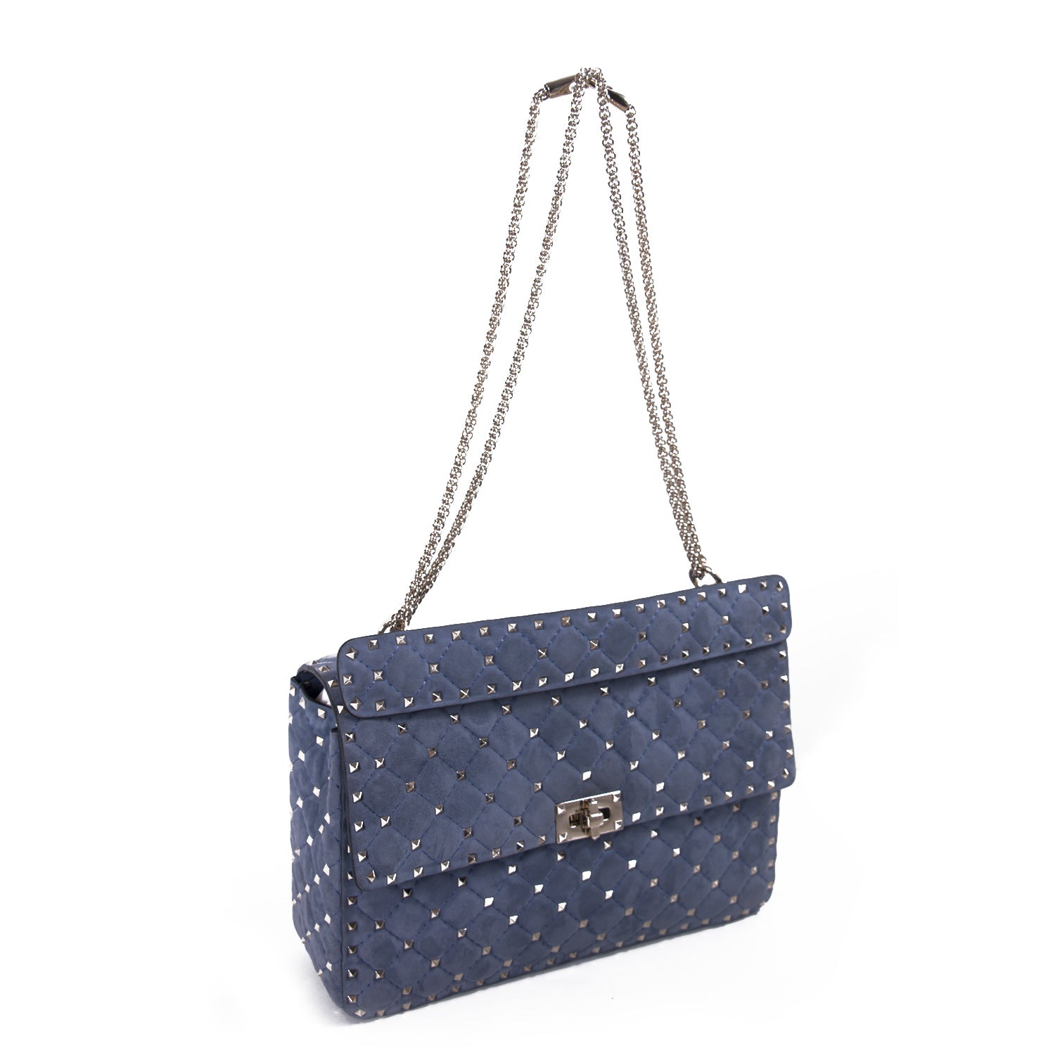Details: Blue Slate Suede / Gold-Tone Hardware / Rockstud Spikes Throughout / Single Flat Handle / Detachable Shoulder Strap / Blue and Red Leather Interior Lining / Three Pockets at Inside one with Zipper / Turn-Lock Closure at Front Flap