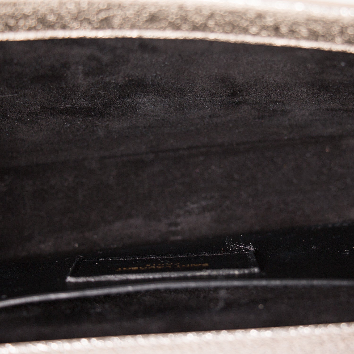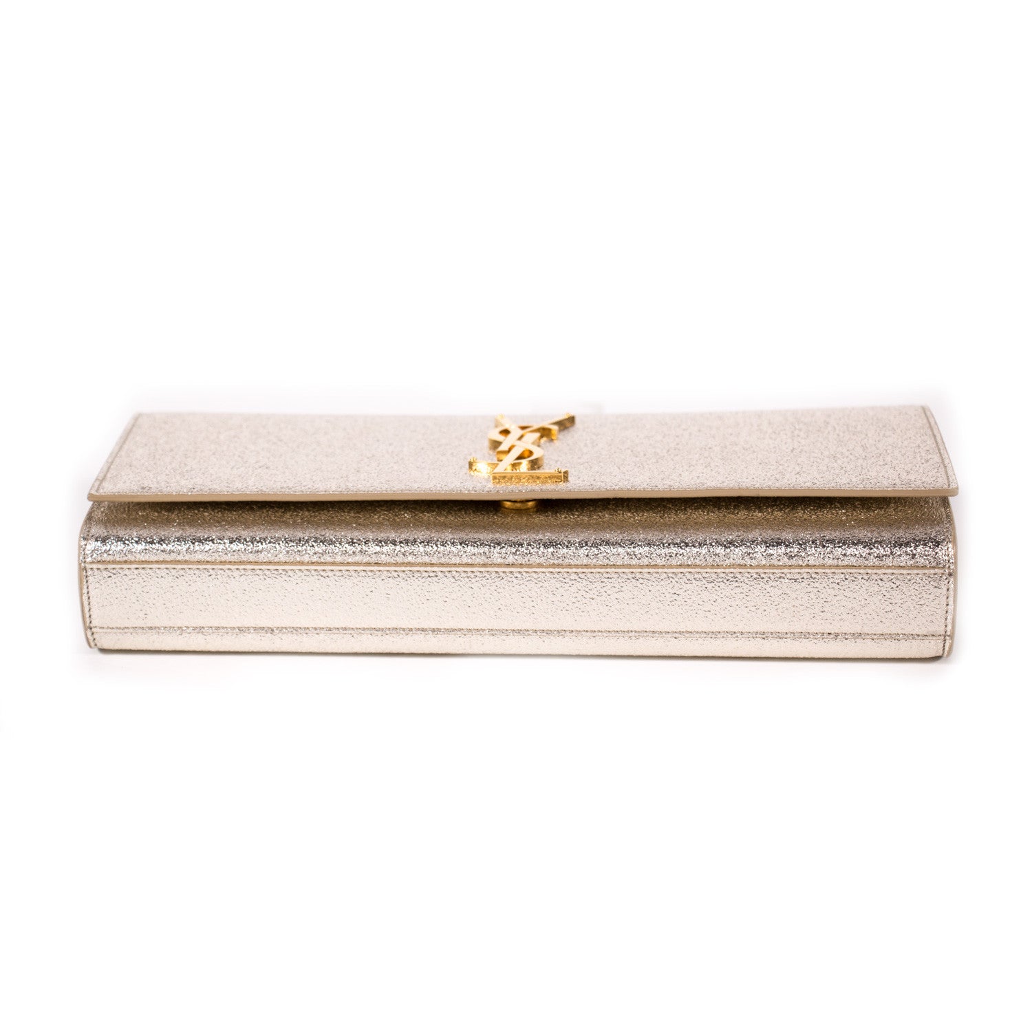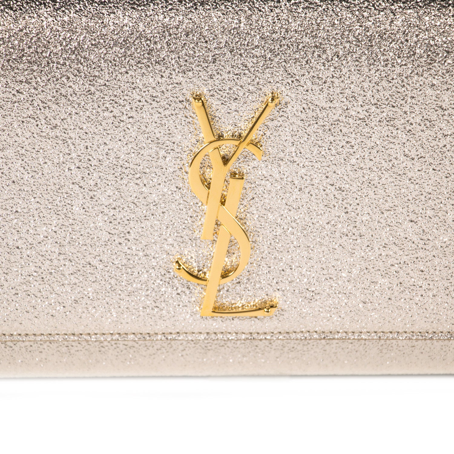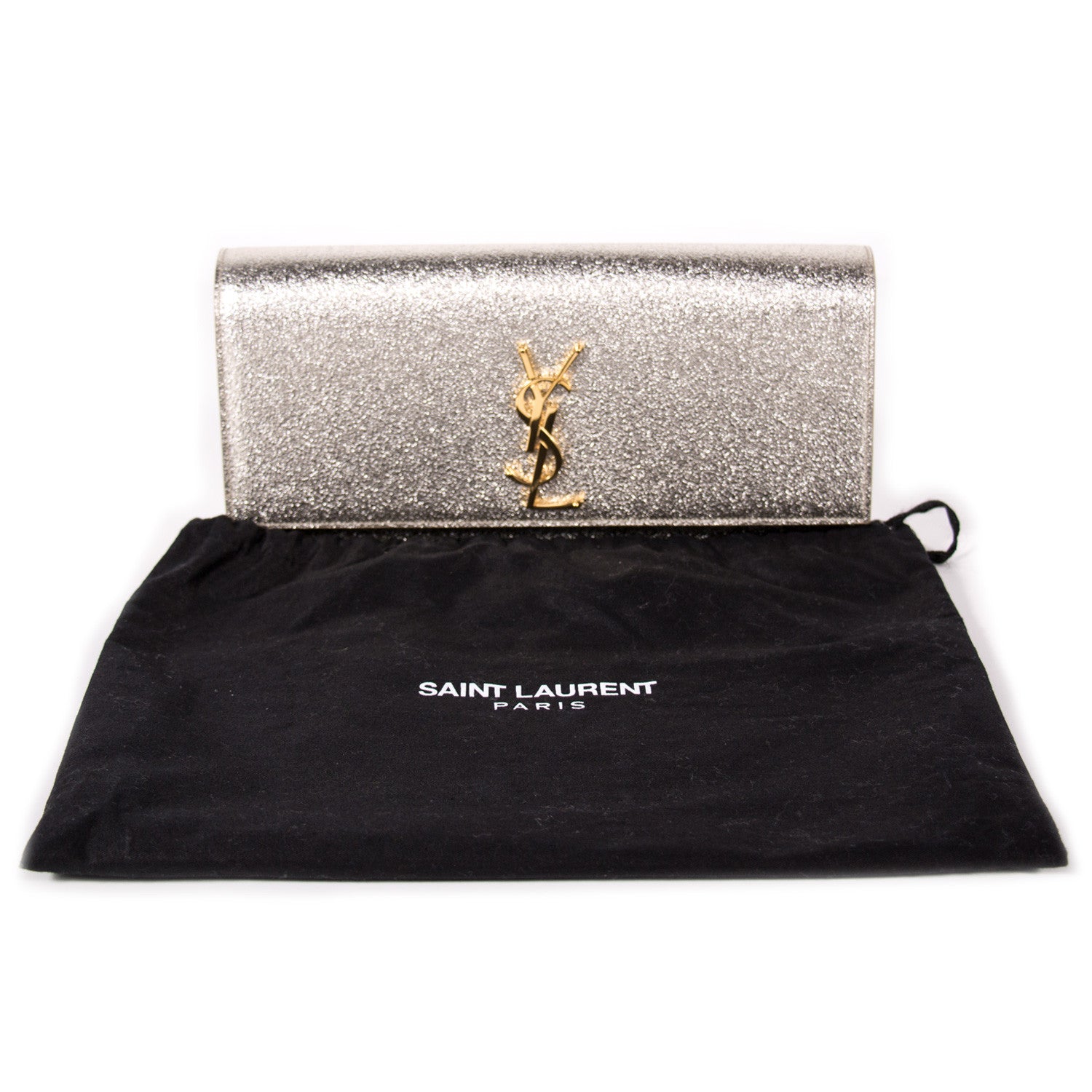 Details: Silver Metallic Leather / Gold-Tone Hardware / YSL Logo Adornment At Front In Gold-Tone / Single Compartment / Black Suede At Interior / Single Slit Pocket At Interior Wall / Flap Closure At Front With Magnetic Snap Closure