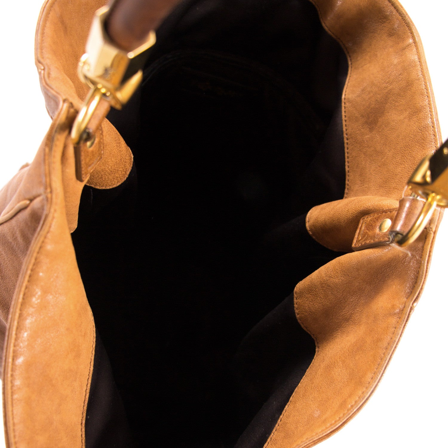 Details: Camel Brown Leather / Gold-Tone Hardware / Single Rolled Handle / Black Satin Lining / Single Compartment / Three Pockets, One With Zip Closure