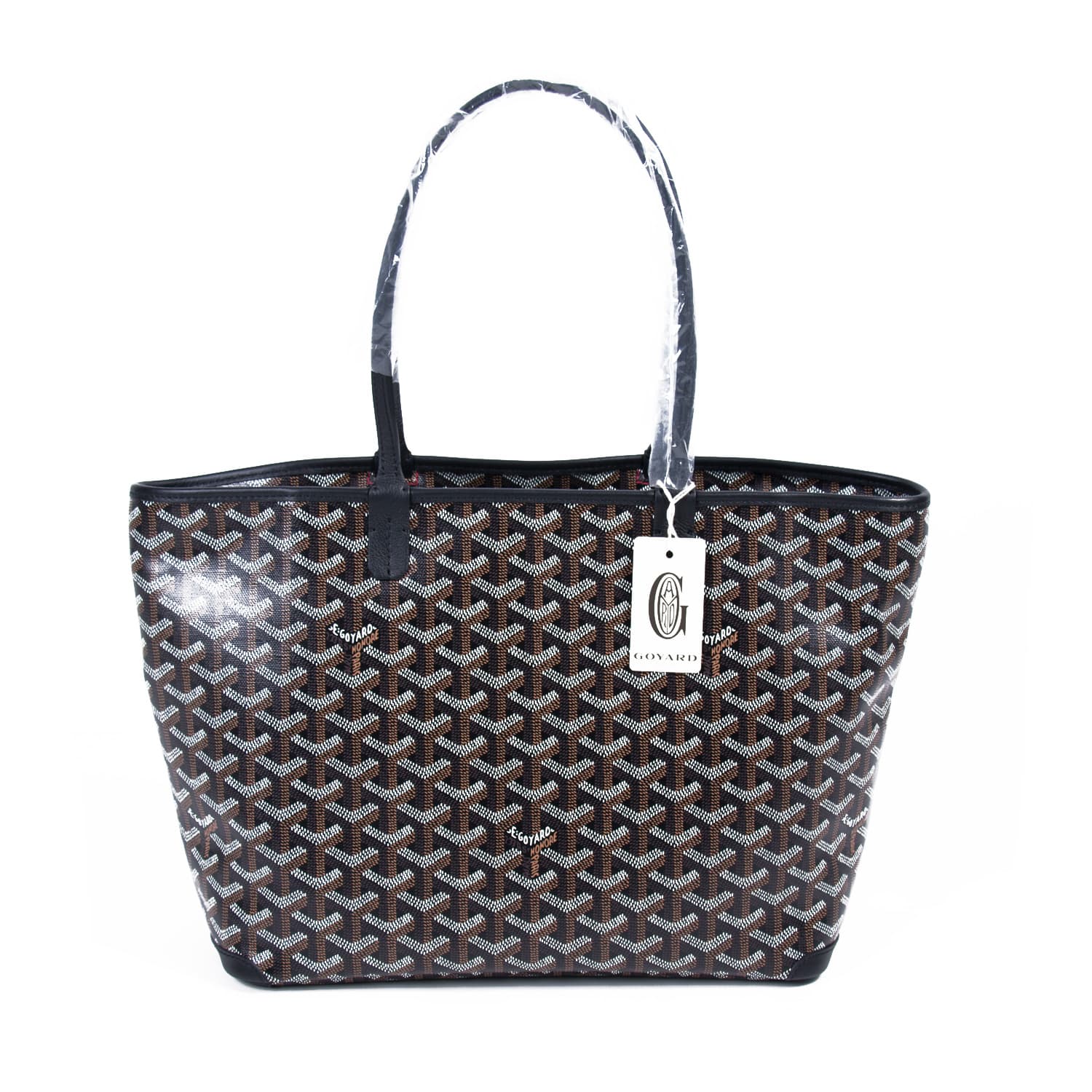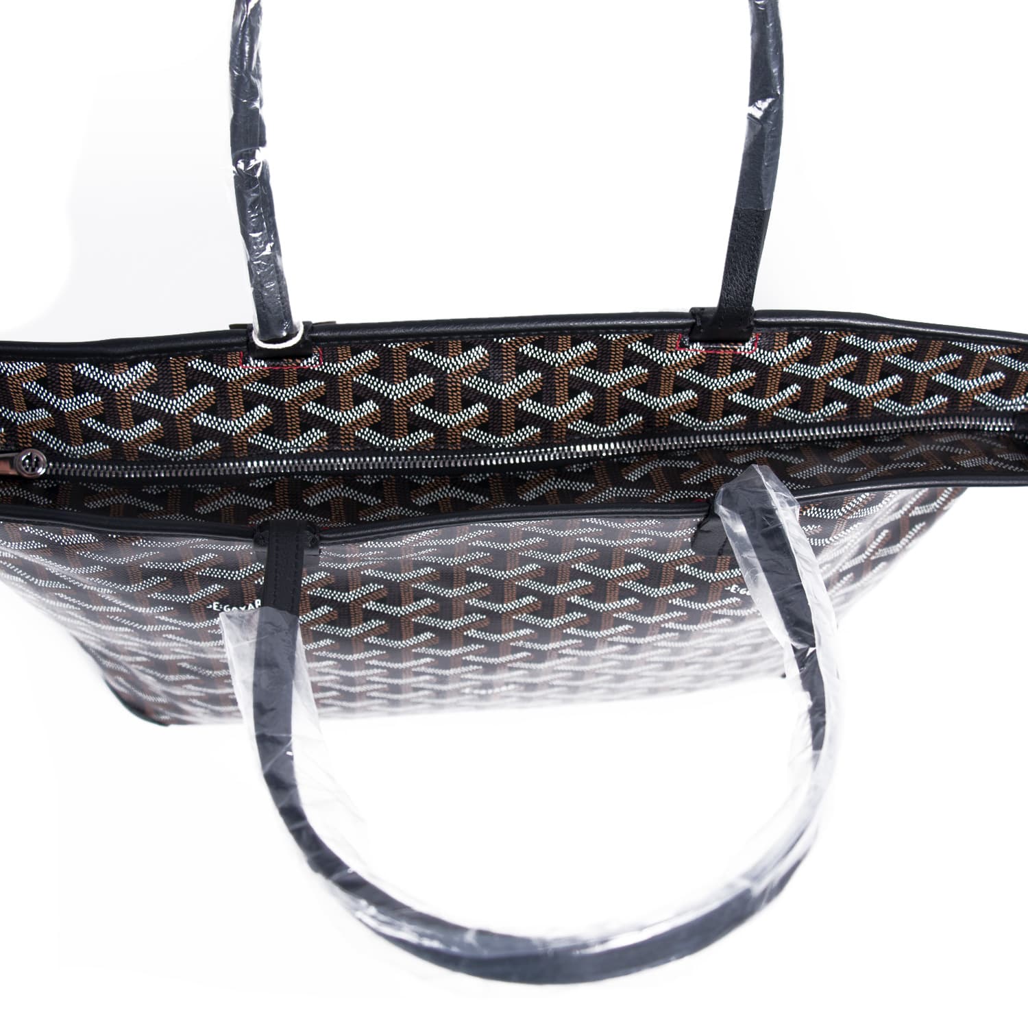 Details: Black, Brown and White Goyardine Coated Canvas / Black Leather Trim / Dual Rolled Handles / Single Compartment / Natural Fabric Lining / Pocket at Inside / Zipper Closure at Top